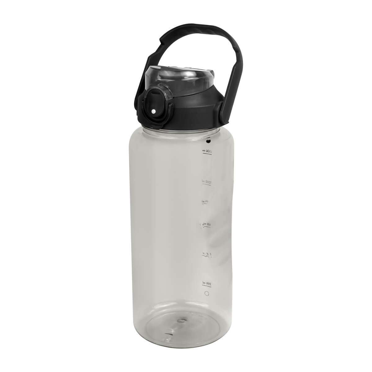 Tapa de plástico con cierre de rosca y boquilla, sobretapa push con botón de seguridad y asa plegable con phone holder para colocar el celular. Cuerpo traslúcido, resaques laterales para un mejor agarre, indicador de mililitros para motivar y controlar tu