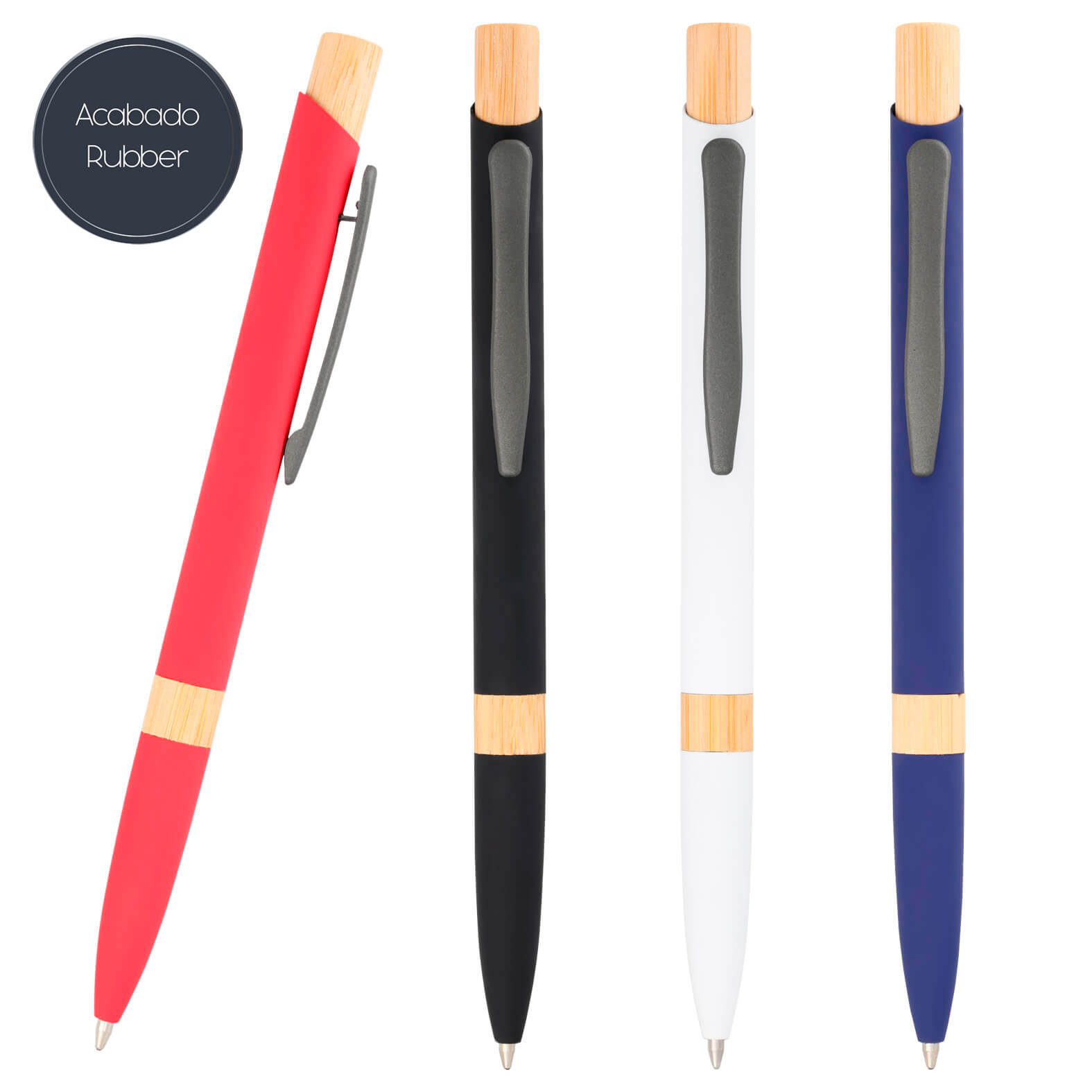 Bolígrafo metálico con acabado rubber; detalle en bambú; clip y mecanismo de click.