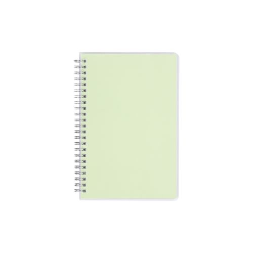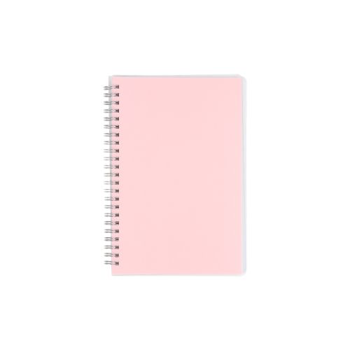 Libreta de tamaño A5 de espiral con cubierta fabricada en PET transparente, esquinas redondeadas y diseño elegante. Incluye 80 hojas con líneas impresas en papel blanco de 70 g, más páginas de color en papel estucado de 157g al inicio y al final. El espir