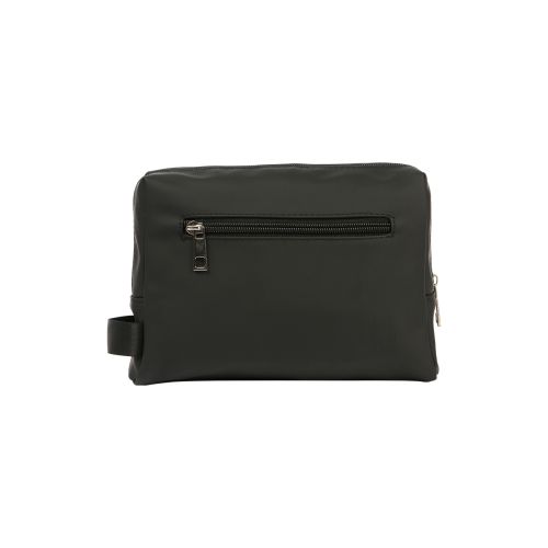 Cosmetiquera fabricada en curpiel y forro de poliéster. Cuenta con un compartimento principal con cierre, dentro de este cuenta con una pequeña bolsa. También tiene en un pequeño bolso con cierre en la parte de atrás.