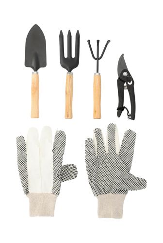 SET DE HERRAMIENTAS JARDIN(Incluye pinzas de corte, pala ancha, horqueta y rastrillo. Guantes de algodón con antiderrapante. Bolsa de poliéster.)