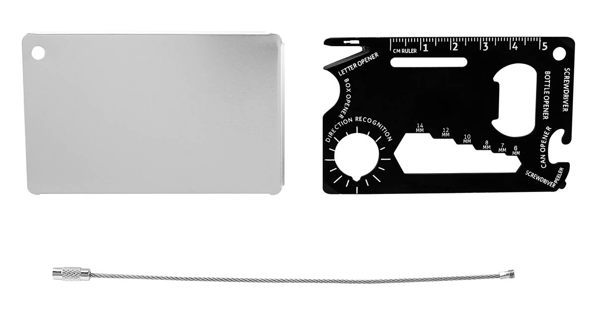 TARJETA MULTIHERRAMIENTAS COMALA(Contiene función de desarmador, abrecartas, destapador, llave inglesa, regla y pelador. Incluye aro para llavero.)