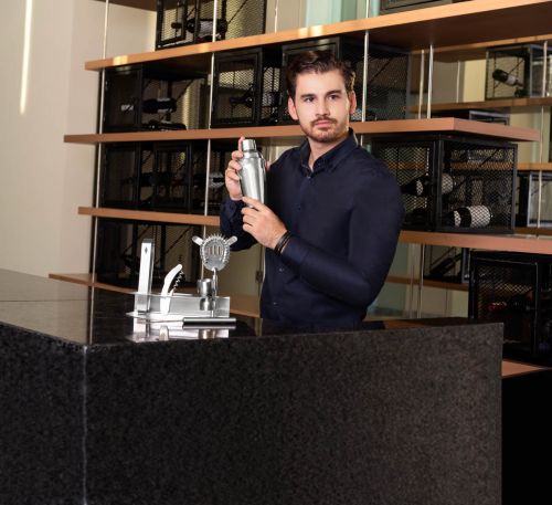SET SKOPJE(Set para preparación de bebidas con base. Incluye shaker, pinzas, sacacorchos, dosificador, colador y cuchillo.)