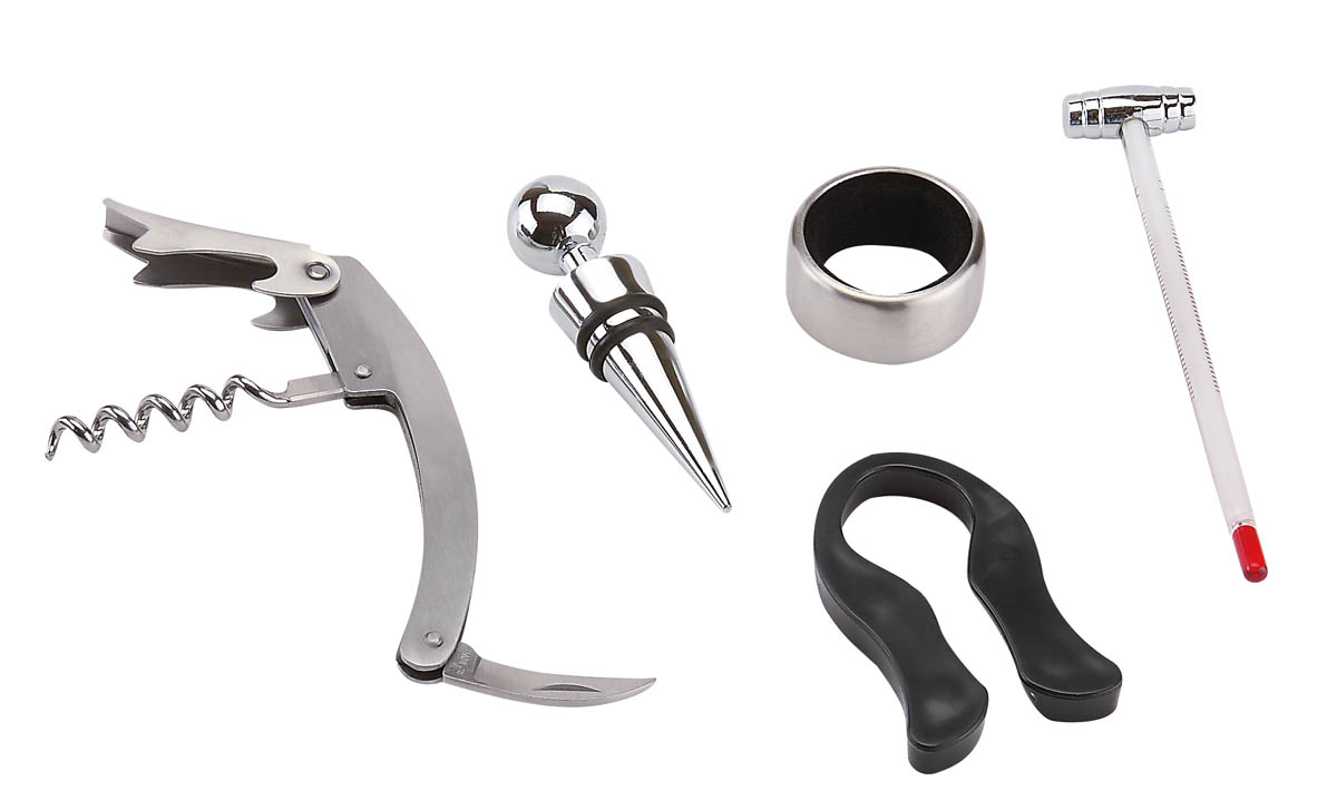 SET PARA VINOS MEDITERRáNEO(Incluye sacacorchos con navaja, stopper, arillo, termómetro y cortador.)
