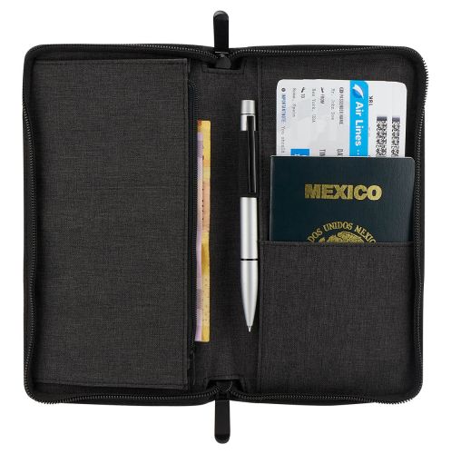 PORTA PASAPORTE WALLY(Compartimento para pasaporte, visa, boleto de avión, elástico para bolígrafo y 1 compartimento con cierre. Bolígrafo no incluido.)