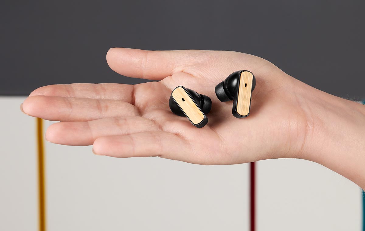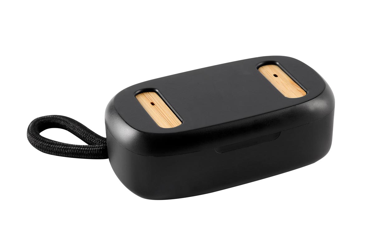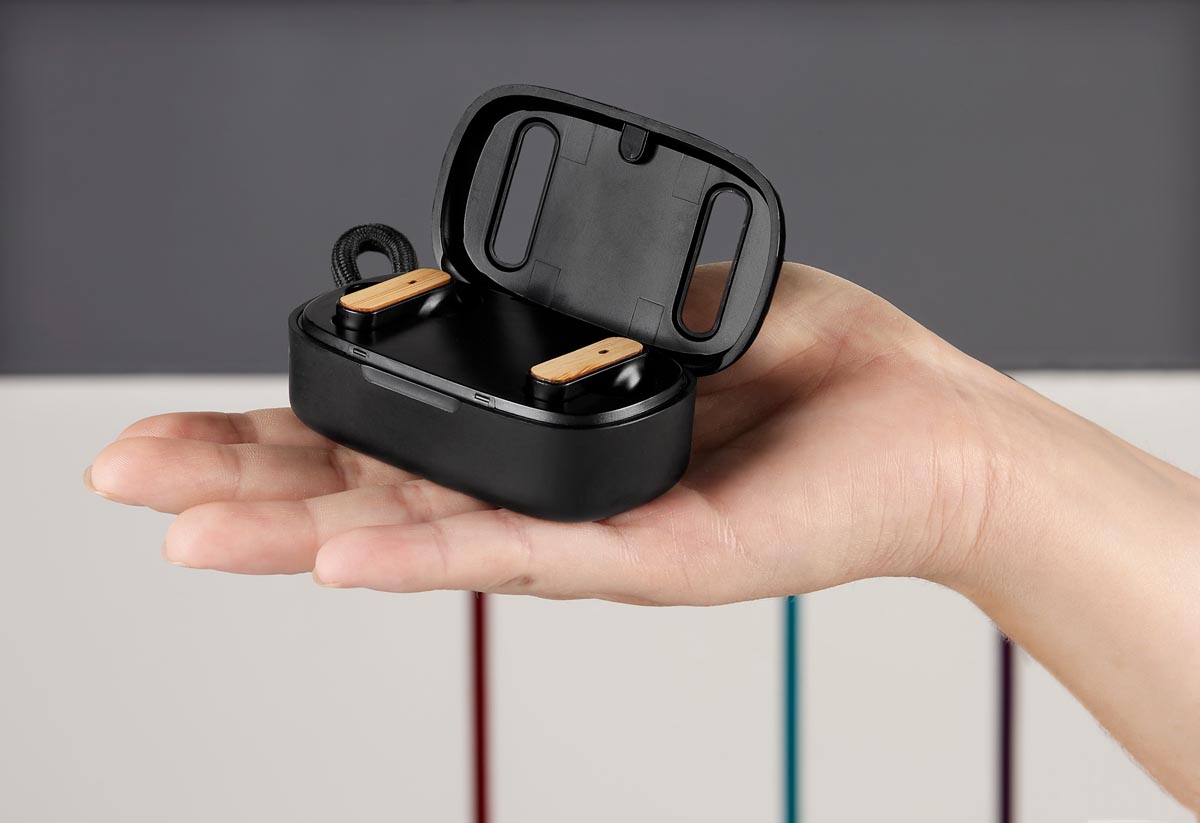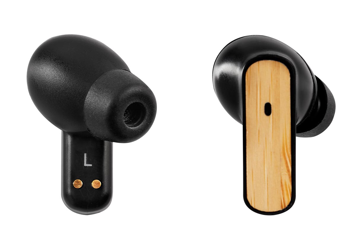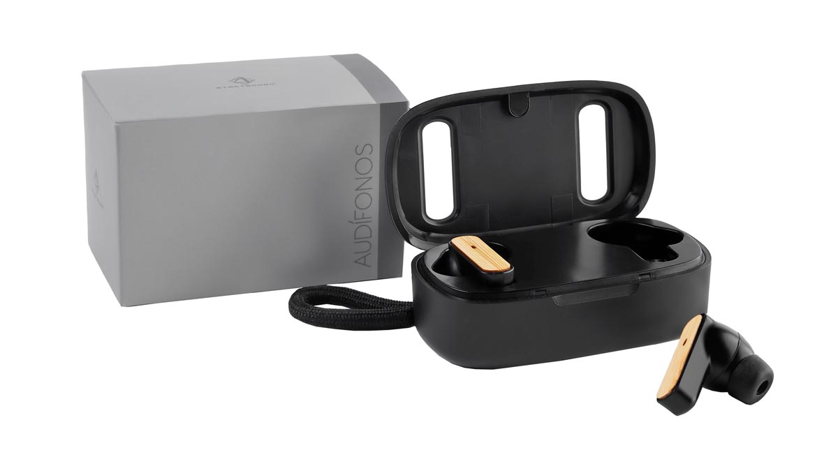 AUDíFONOS(Audífonos bluetooth con base recargable. Hecho de plástico recilclado y bambú que lo hacen amigable con el medio ambiente. Touch para control de reproducción de música y función de llamada, reproducción de música 4 horas, rango de conexión de 10