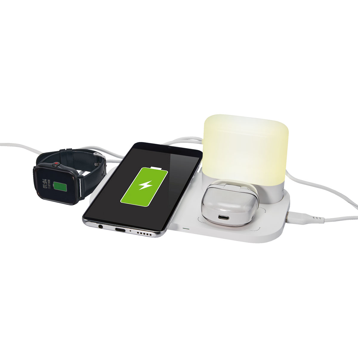 CARGADOR CON LáMPARA LAMPPU(Cargador inalámbrico para smartphone y earbuds. Incluye lámpara con 3 diferentes intensidades. Salida USB para conectar otro dispositivo como por ejemplo un smartwatch.)