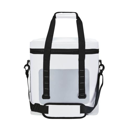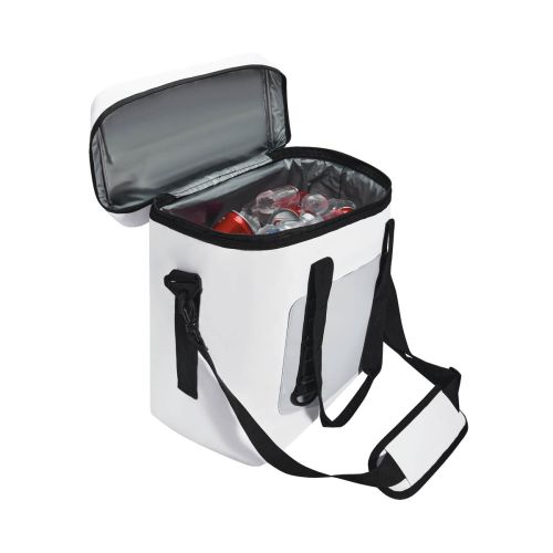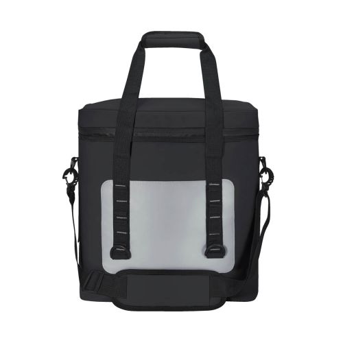HIELERA WATERPROOF(Interior y exterior plastificado impermeable. Bolsa principal con cierre, bolsillo frontal. Incluye asa de mano con velcro y correa larga ajustable con broches de plástico y soporte acojinado. Capacidad para 24 latas.)