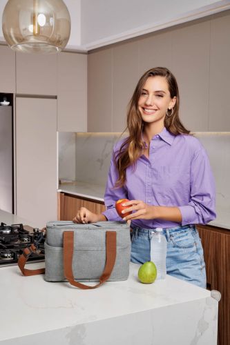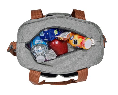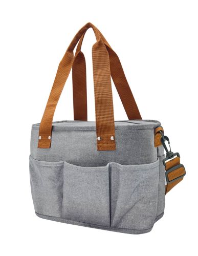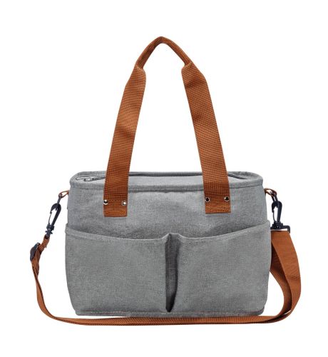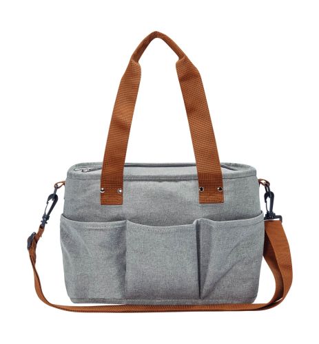 HIELERA NANCY(Hielera con interior plastificado impermeable. Bolsillo principal con cierre, 3 bolsillos frontales y 2 bolsillos posteriores. Asa ajustable con broches de plástico.)