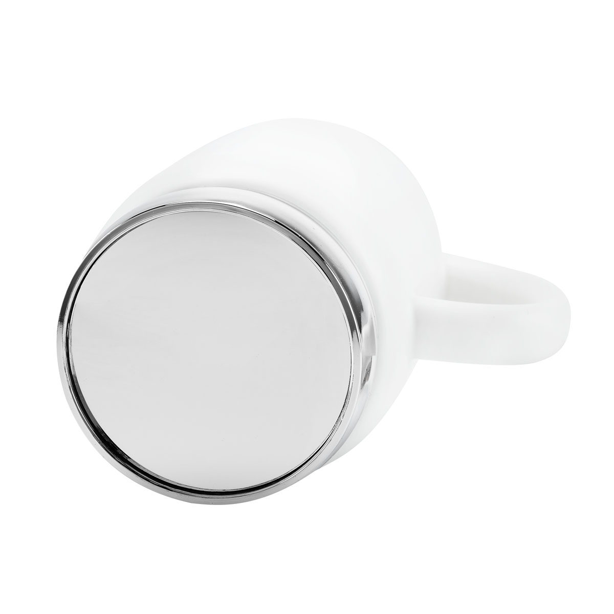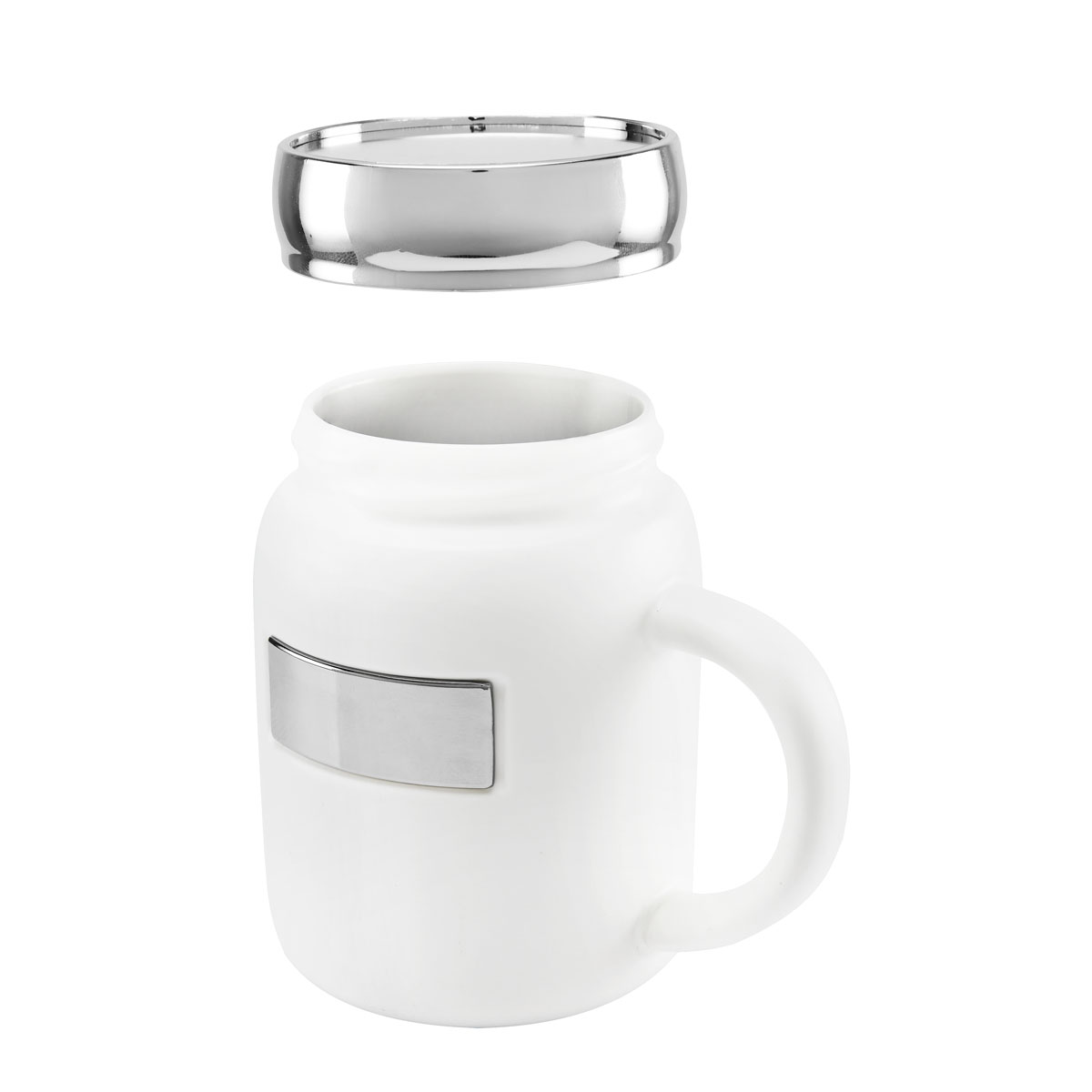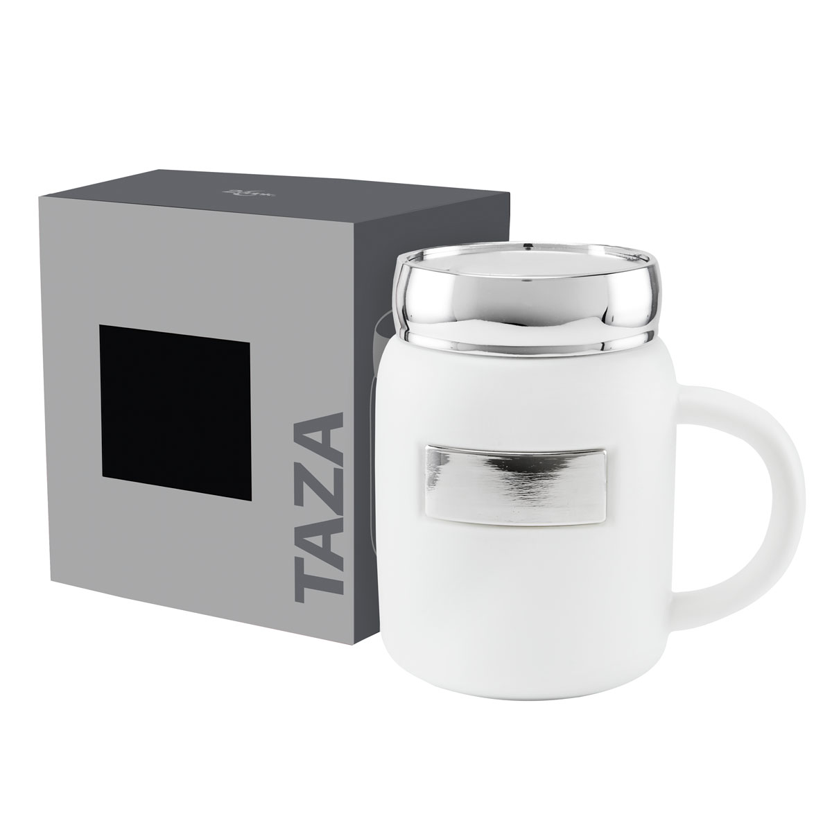 TASA ILMA(Taza de cerámica con tapa de plástico. Tapa con cierre de rosca y terminado cromado. Incluye placa metálica en el frente para grabado láser. Exterior con terminado mate. No usar en microondas.)