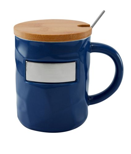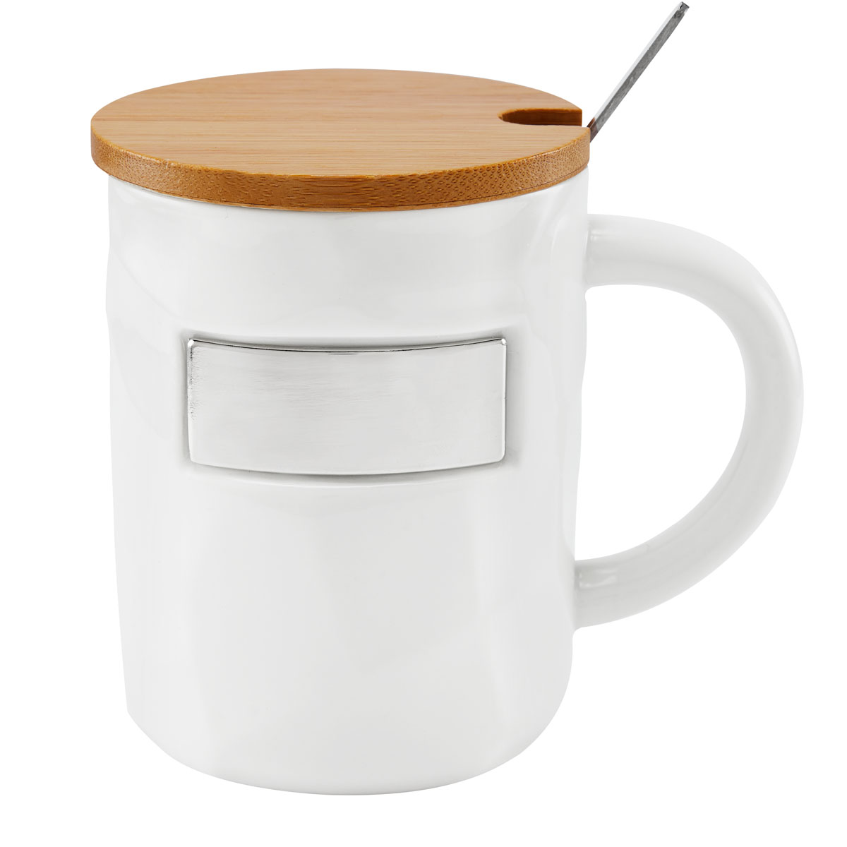 TAZA BAMBUSA(Taza de cerámica con tapa de bambú y cuchara de metal. Incluye placa metálica en el frente para grabado láser. Terminado glossy con el interior blanco. No usar en microondas.)