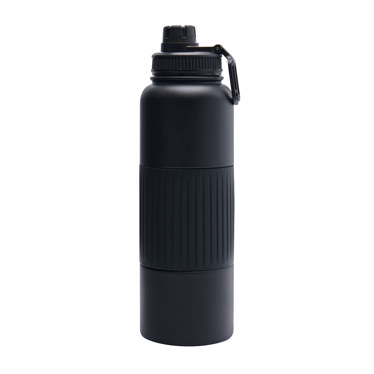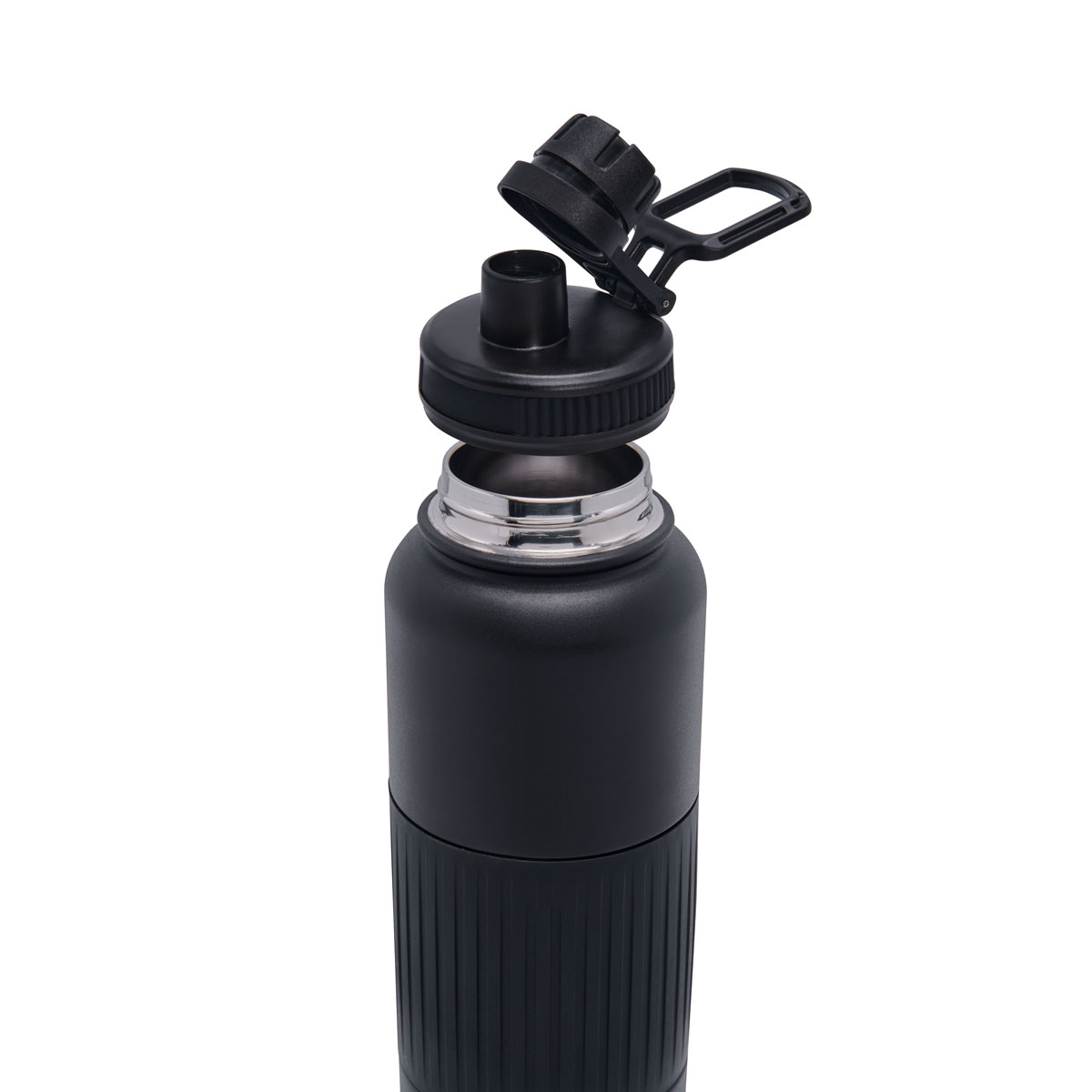 TERMO HéRCULES(Termo doble pared con manga de silicón. Cerrado al vacío. Interior y exterior de acero inoxidable. Terminado tipo rugoso. Tapa de plástico con doble boquilla y asa. Incluye caja individual.)