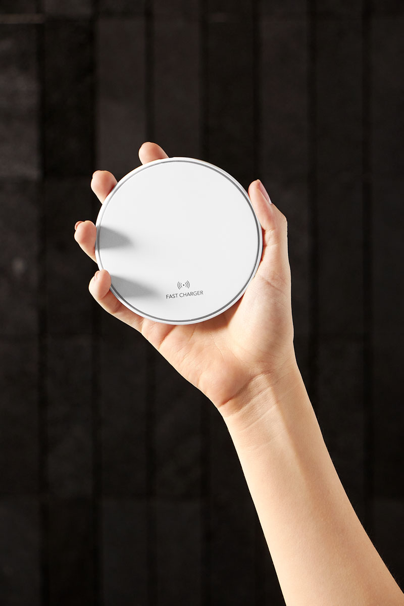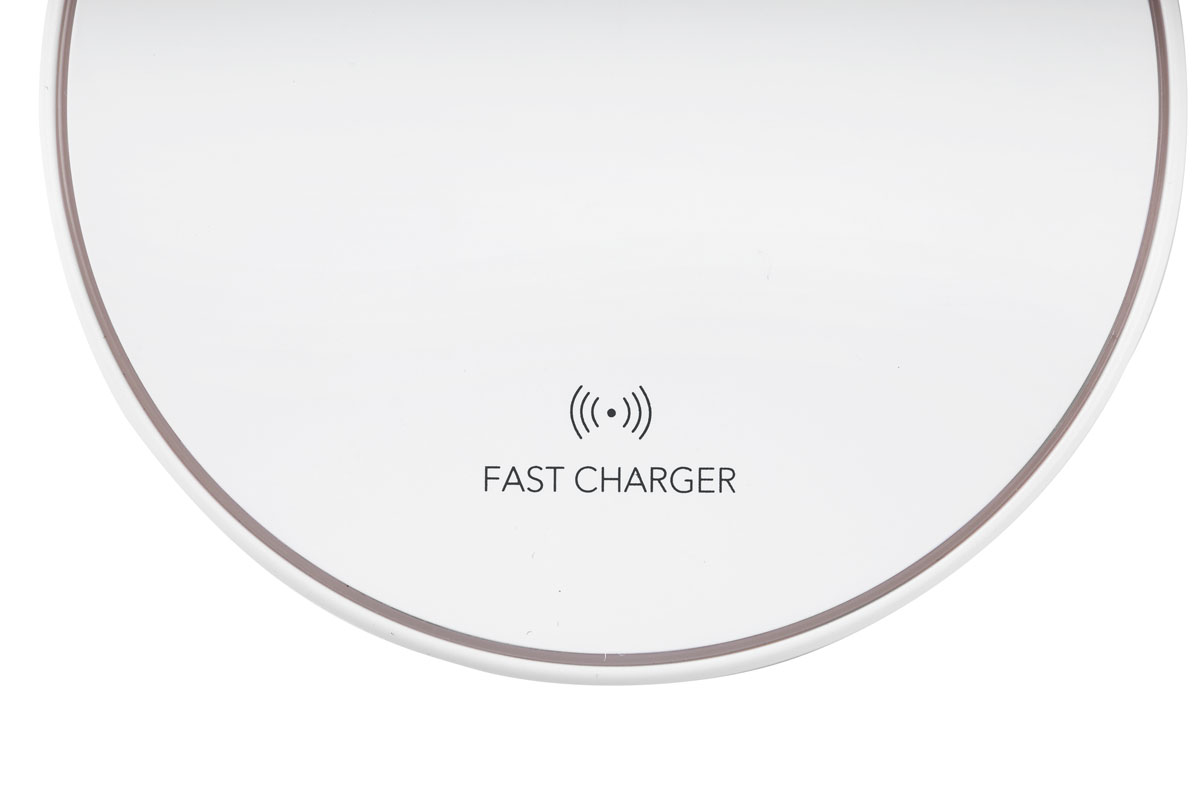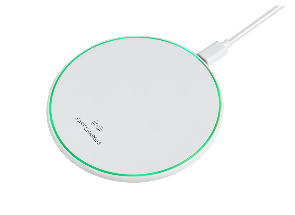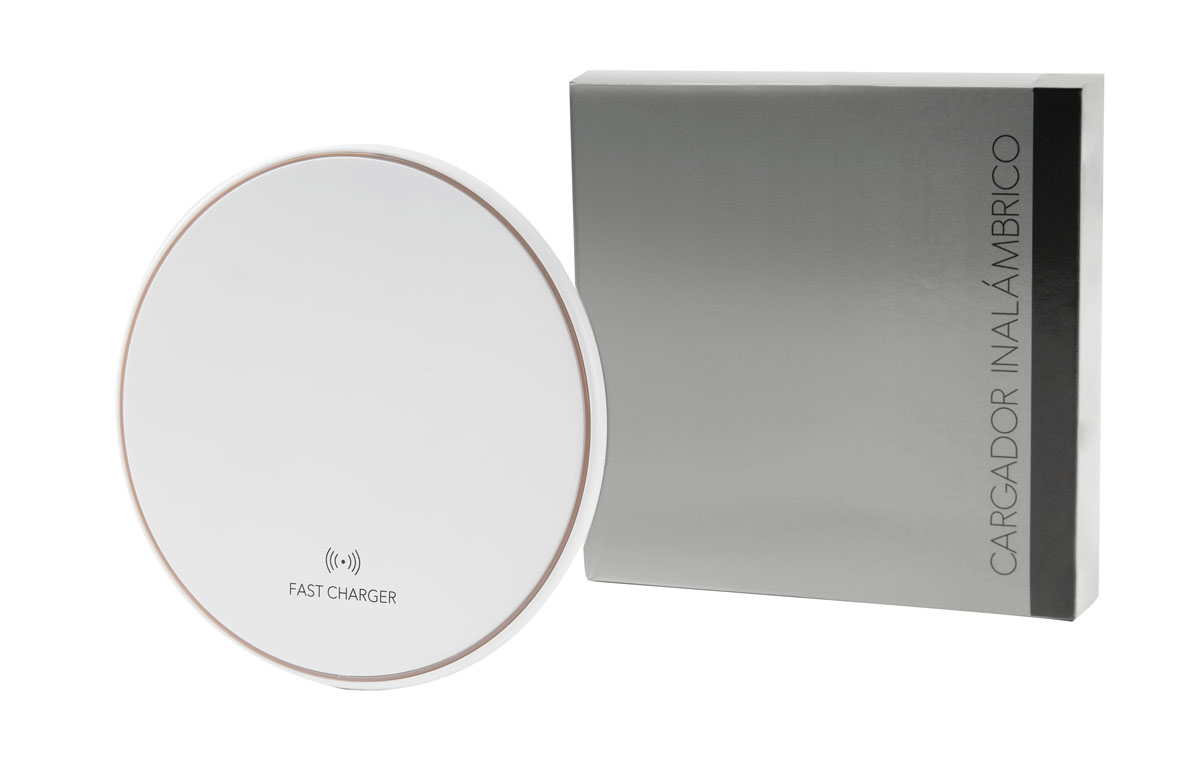 Cargador inalámbrico fast charge. Velocidad máxima de carga 15 W. Se enciende luz color verde cuando está en reposo y luz color azul cuando está en proceso de carga. Incluye cable auxiliar tipo C y caja individual.