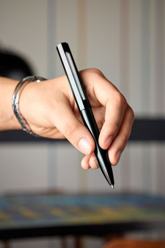 Mecanismo twist. Forma hexagonal en la parte superior del bolígrafo. Incluye estuche.