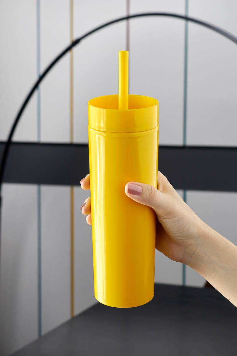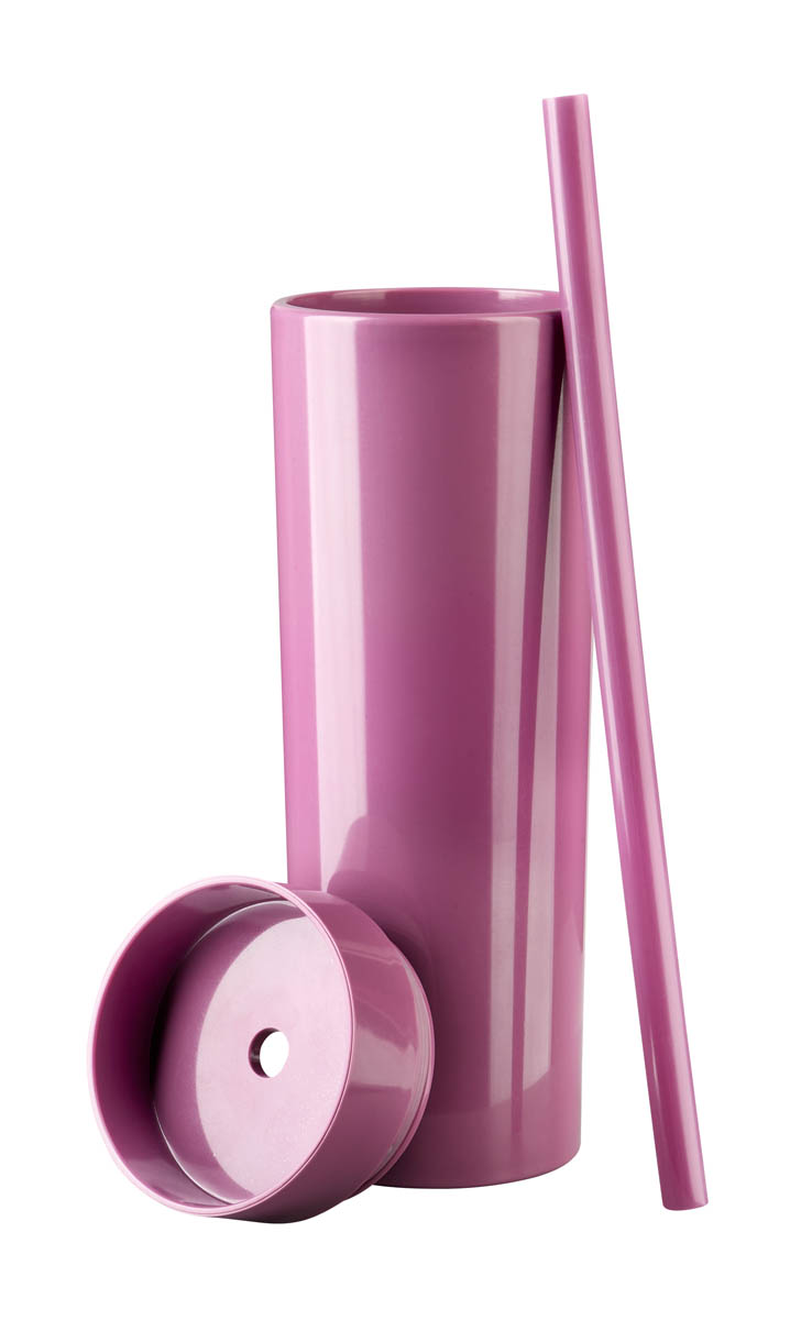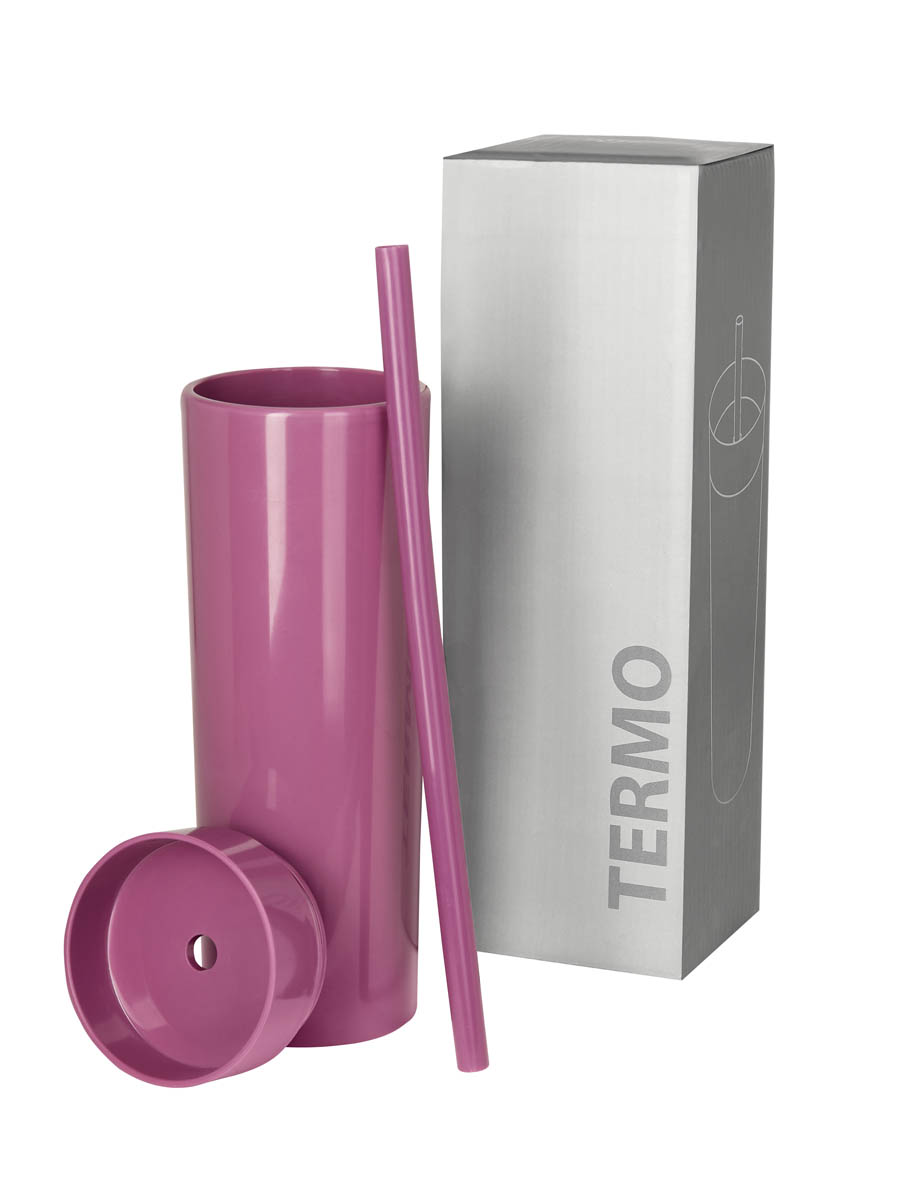 Doble pared. Pares interna y externa de plástico. Tapa de plástico con cierre a presión. Incluye popote y caja individual.