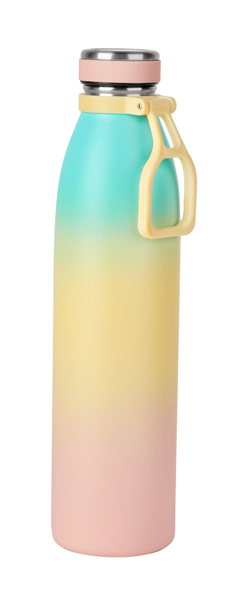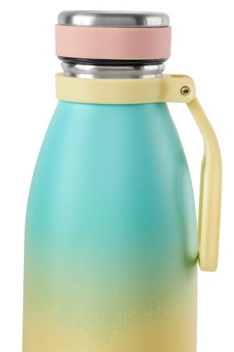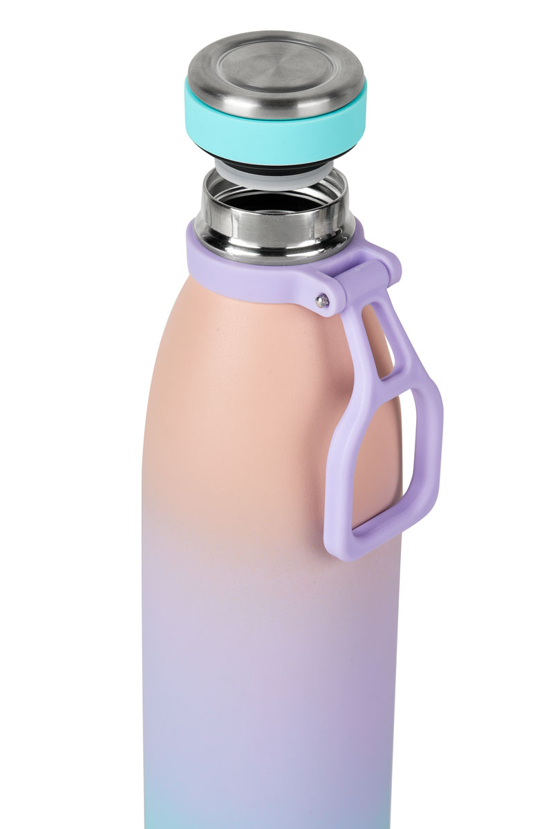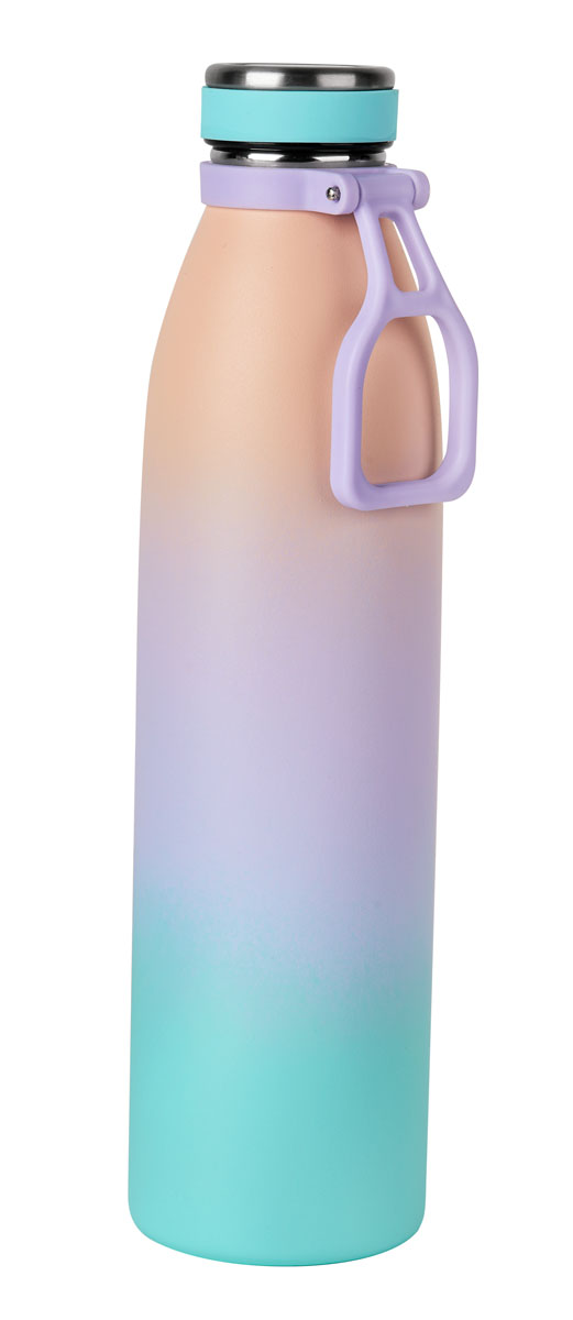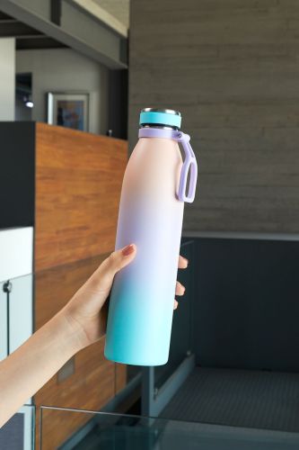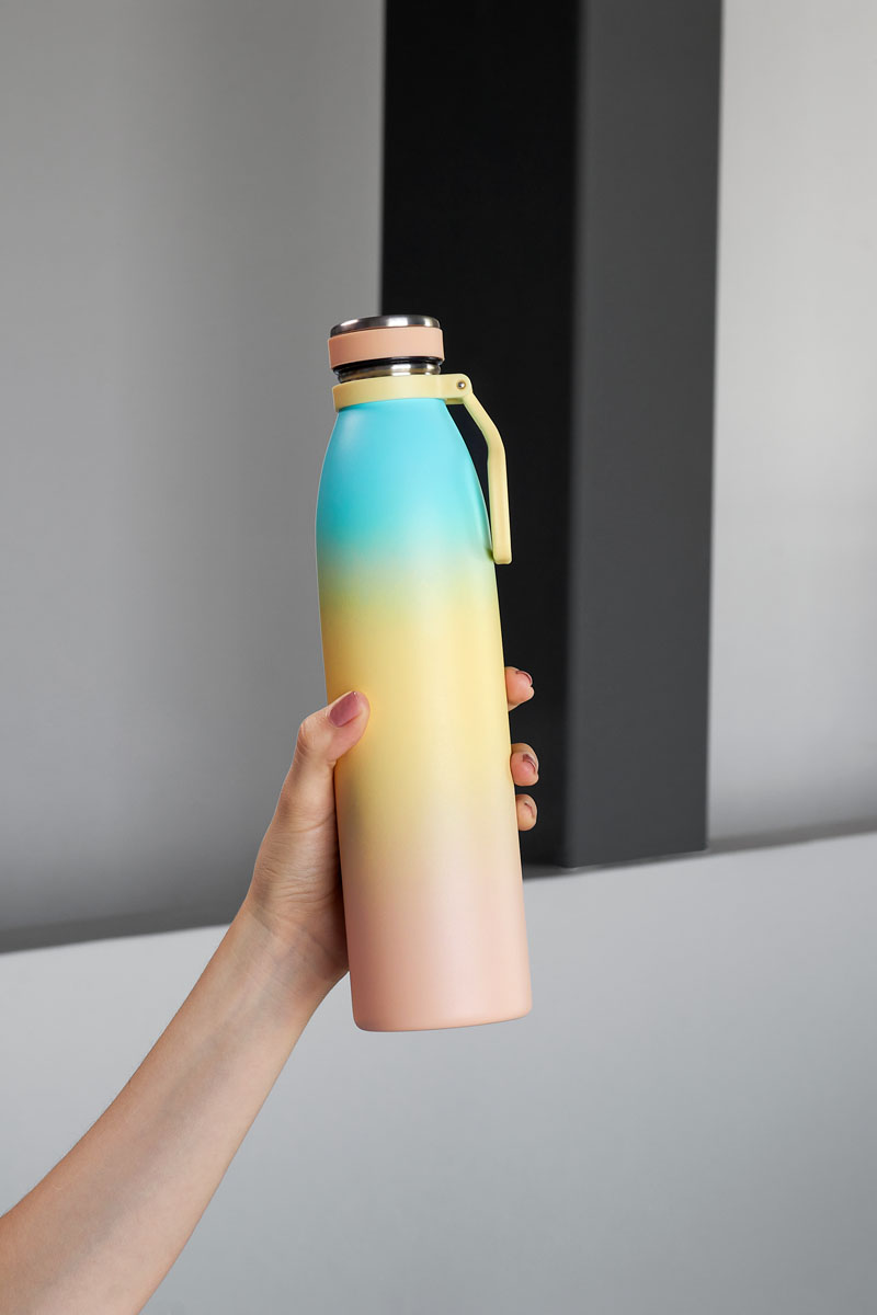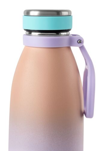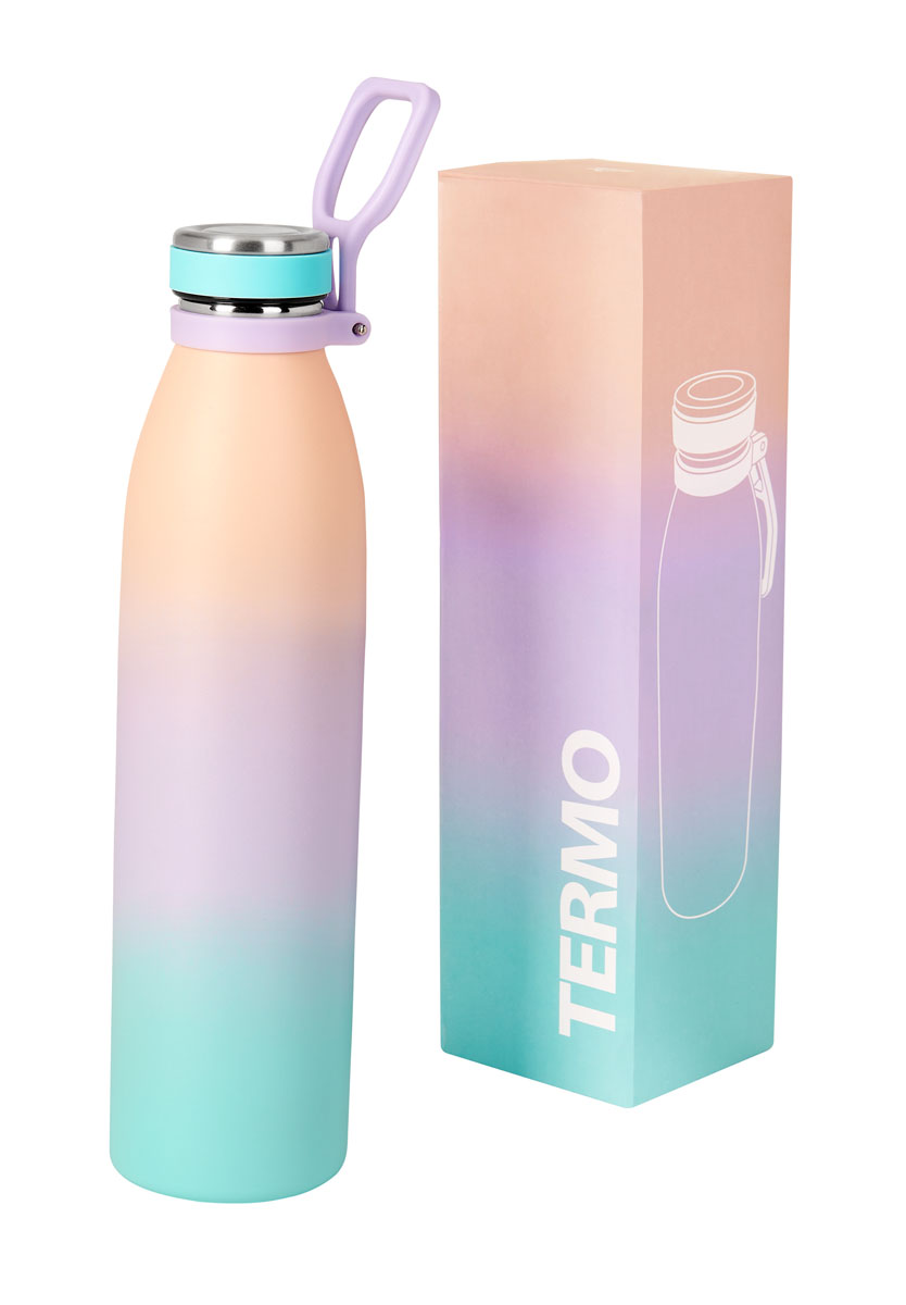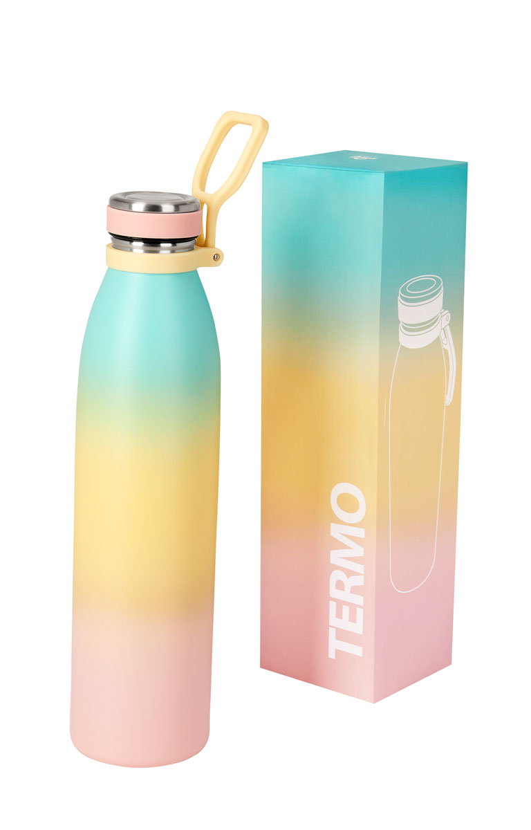 Doble pared. Cerrado al vacío. Pared interna y externa acero inoxidable. Terminado rugoso color degradado. Tapa de rosca. Cuenta con asa. Mantiene temperatura caliente 8 hrs y temperatura fría 12 hrs aproximadamente. Incluye caja individual.