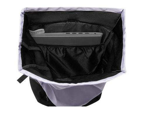 Bolsa principal con broche, interior con compartimento para laptop. Incluye bolsillo frontal con cierre y bolsillo lateral de malla