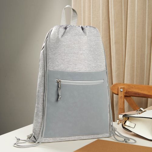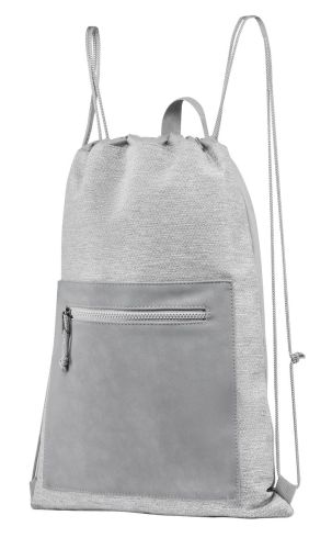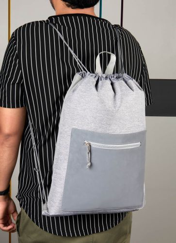 Bolsa-mochila con tirantes de cordón y cerrado de jareta. Cuenta con una bolsa frontal con cierre y asas para usar como bolsa.