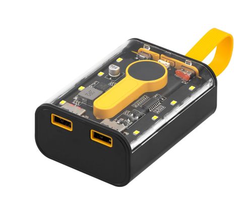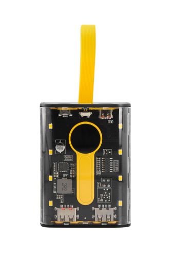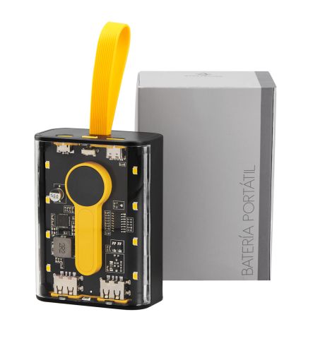 Batería auxiliar para smartphone de 10,000 mAh con 2 puertos de carga USB, 1 puerto tipo C y 1 puerto Micro USB. Fast charger. Incluye display para mostrar el nivel de carga, correa de silicón en la parte superior y caja individual.
