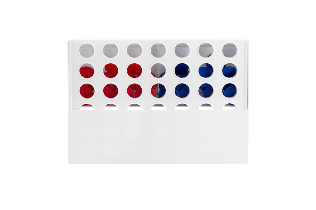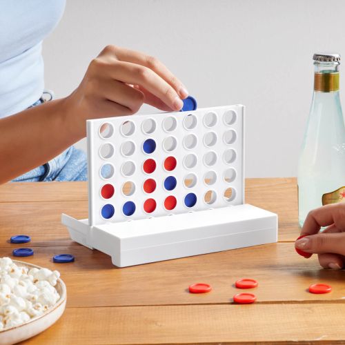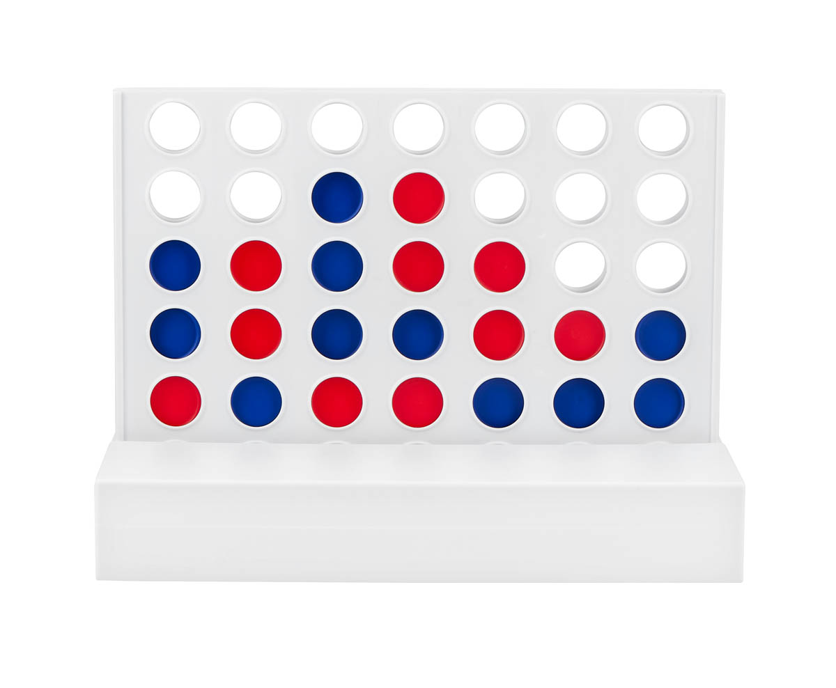 Tablero 4 en línea. Juego de mesa para dos jugadores. Contiene 21 fichas azules, 21 fichas rojas y base de plástico. El objetivo es alinear cuatro fichas sobre un tablero formado por seis filas y siete columnas. Por turnos, los jugadores deben introducir
