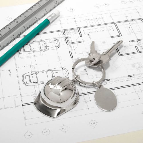 Llavero fabricado en metal con acabado cromado brillante. Por su diseño en forma de casco se convierte en el accesorio perfecto para los amantes de la industria de la construcción y seguridad. Además, incluye una placa ovalada para personalizar. Co