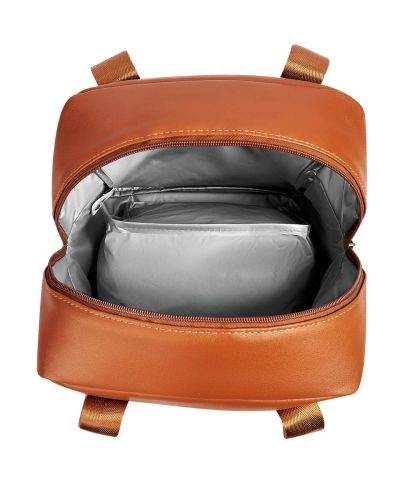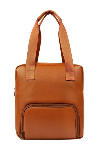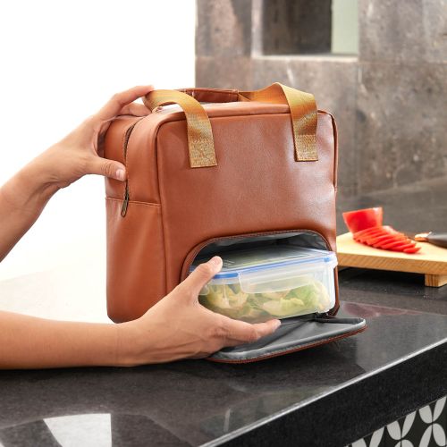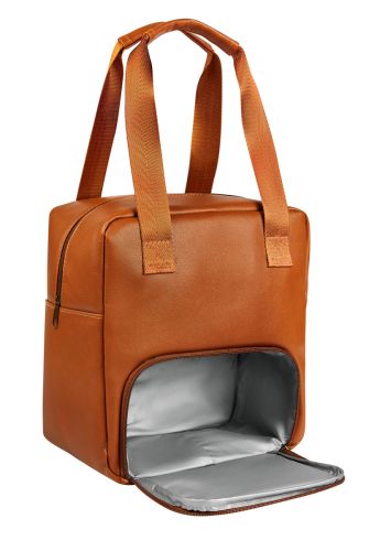 Lonchera de curpiel. Interior plastificado. Compartimento principal y bolsillo frontal con cierre. Asas de tela con agarradera de curpiel