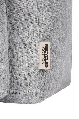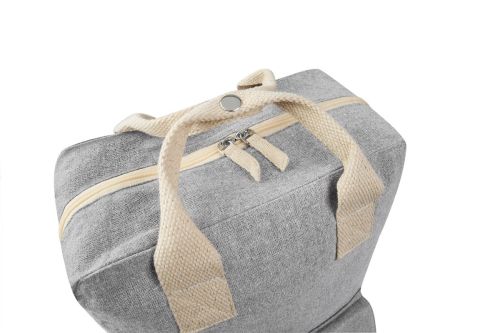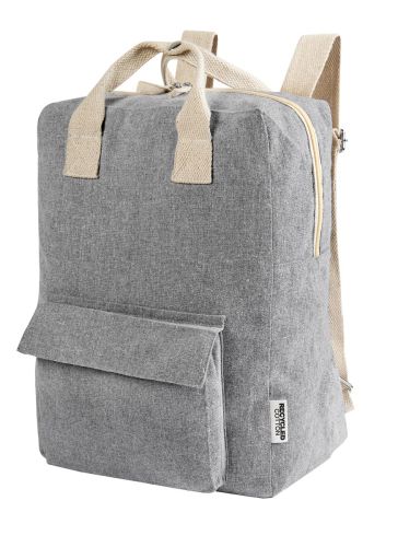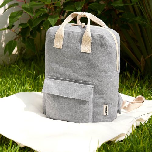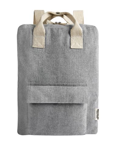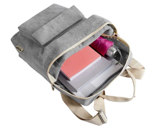 Mochila ecológica de algodón reciclado. Compartimento principal con cierre. Bolsillo frontal con velcro. Asa superior doble con broche metálico y asas para hombro ajustables.
