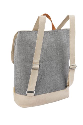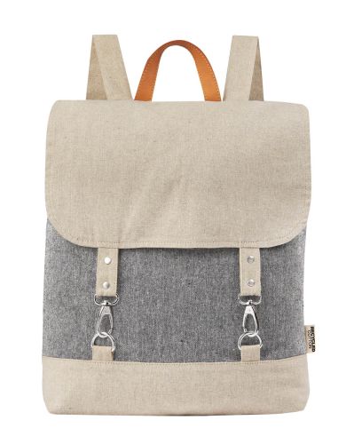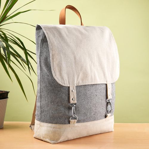 Mochila ecológica de algodón reciclado. Compartimento principal con solapa y 2 broches.