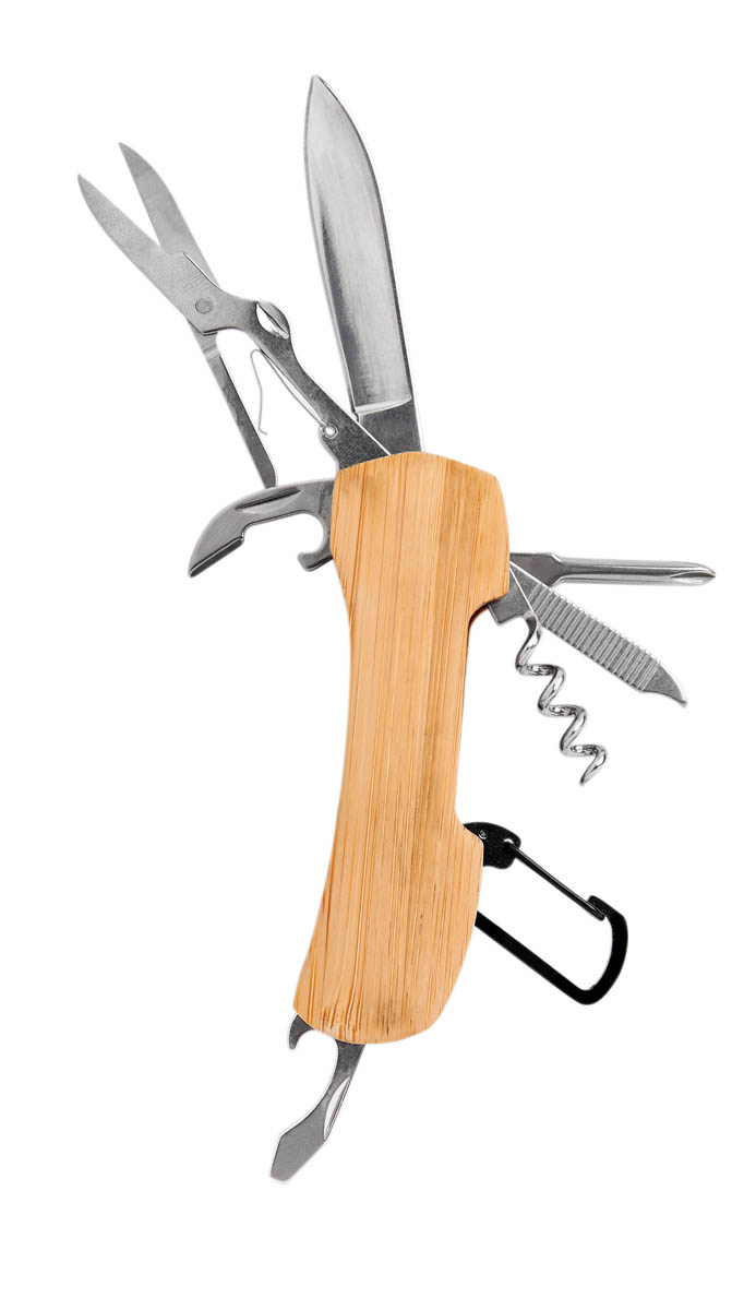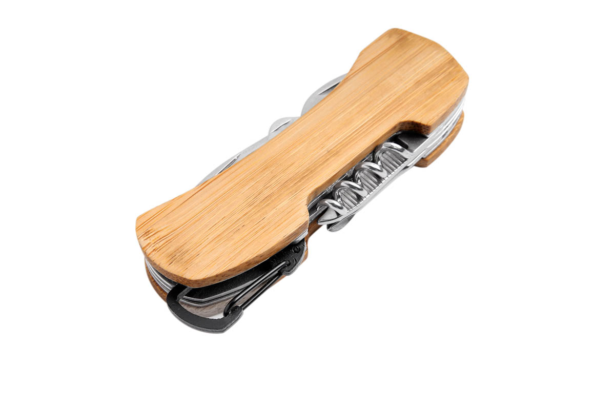 La navaja de bambú con 8 accesorios es una herramienta versátil y ecológica que te acompañará en todas tus aventuras. Sus accesorios incluyen una hoja afilada, abrelatas, tijeras, destornillador plano con abrebotellas, destornillador de cruz, limpi