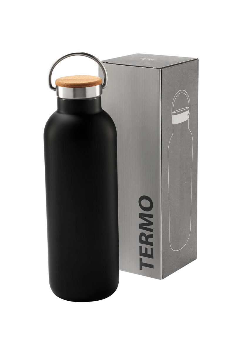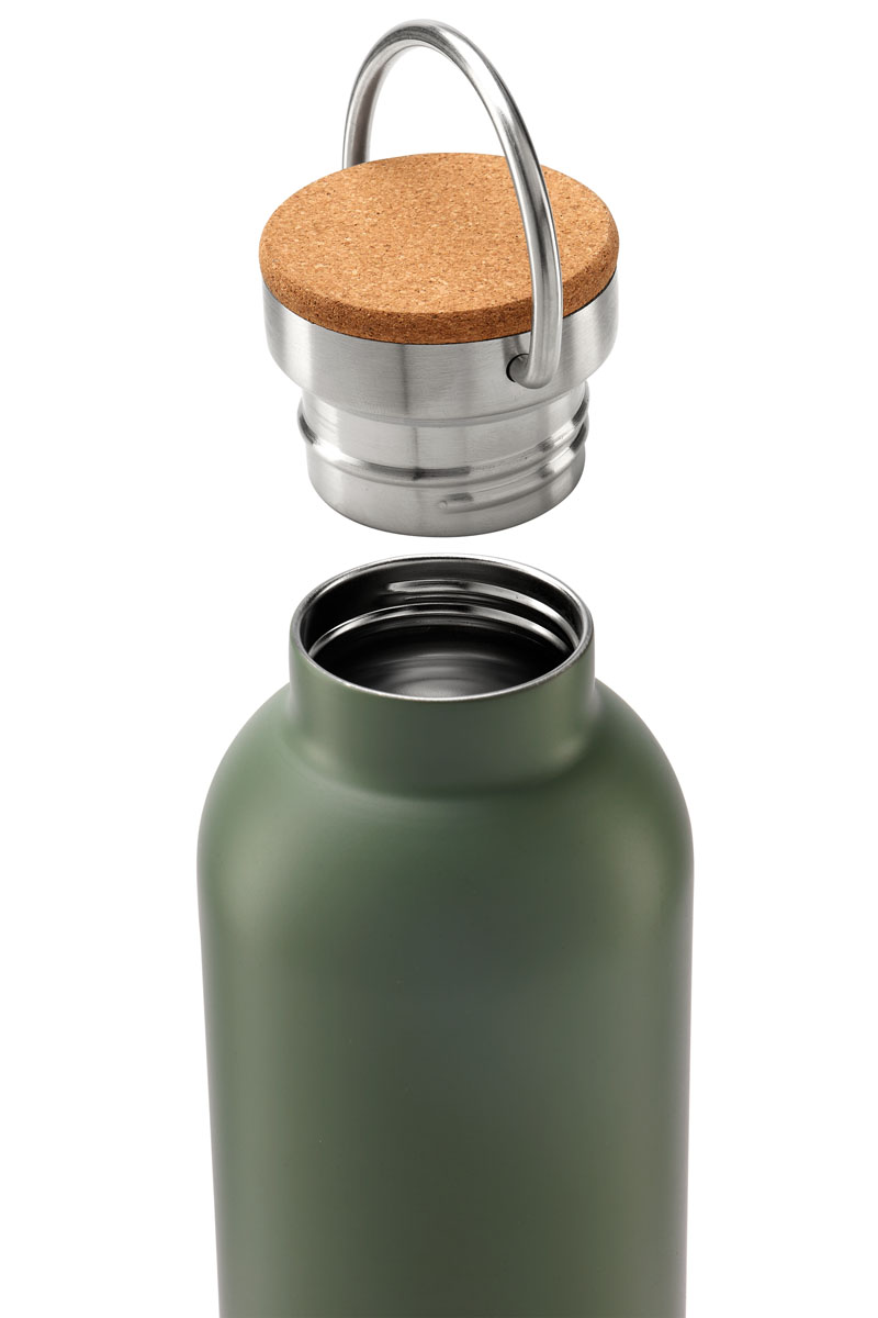 Doble pared. Cerrado al vacío. Pared interna y externa de acero inoxidable. Tapa con sistema de rosca de acero inoxidable con corcho y asa metálica. Mantiene temperatura caliente 6 hrs y temperatura fría 12 hrs. Incluye caja individual.