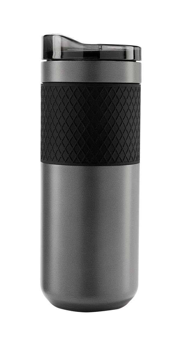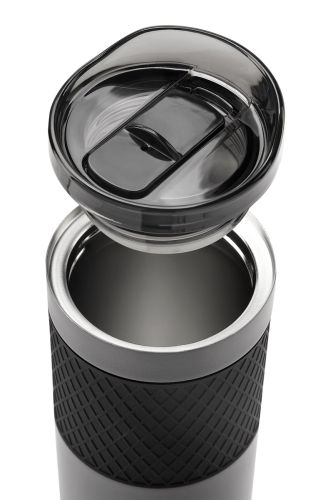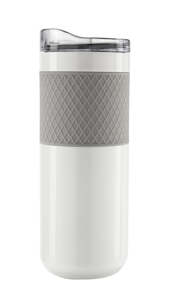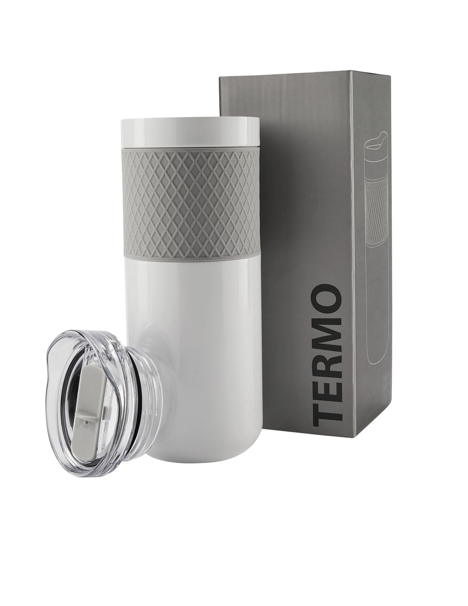 Doble pared. Cerrado al vacío. Pared interna y externa de acero inoxidable. Incluye tapa de plástico con cierre de rosca y válvula de seguridad. Banda de silicón texturizada antiderrapante. Mantiene temperatura caliente 6 hrs y temperatura fría 8 hrs.Incl