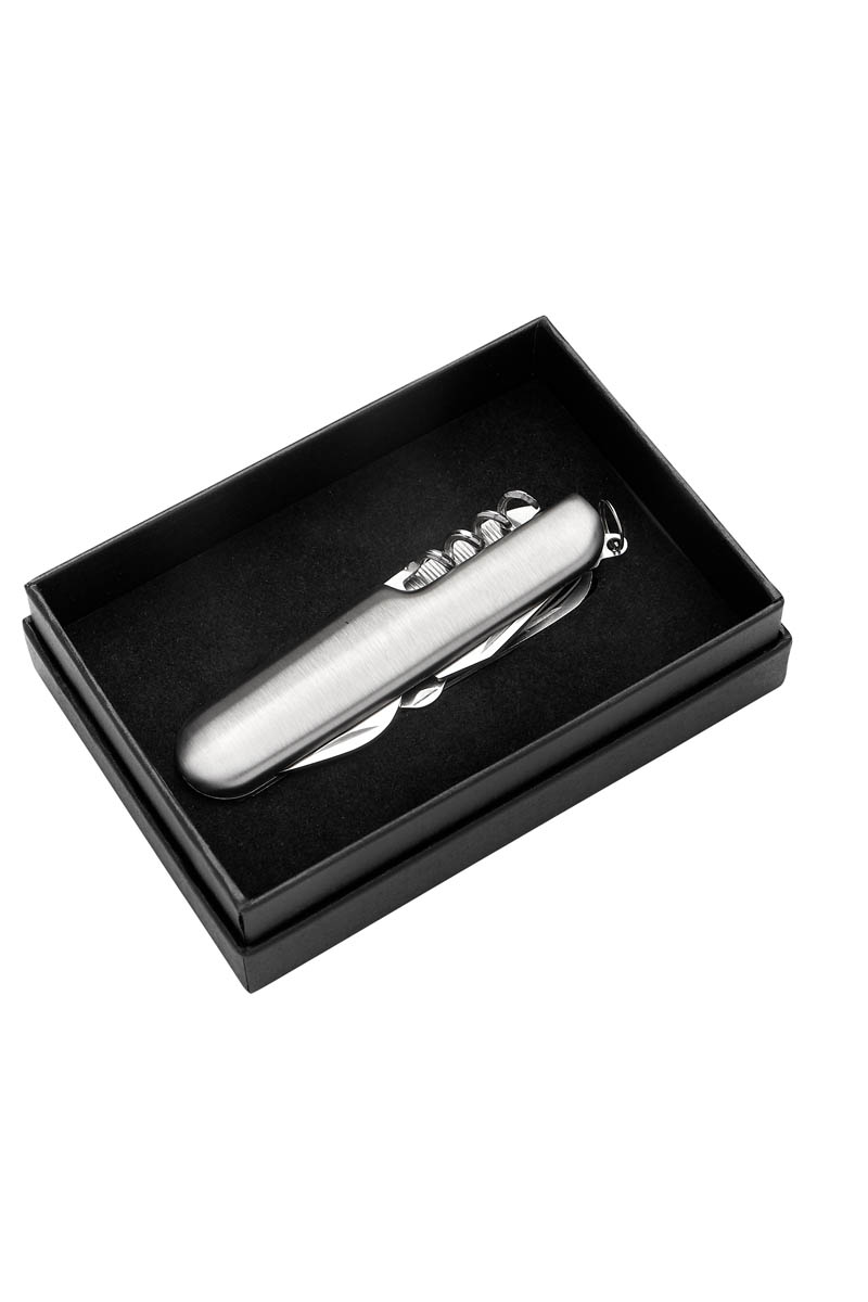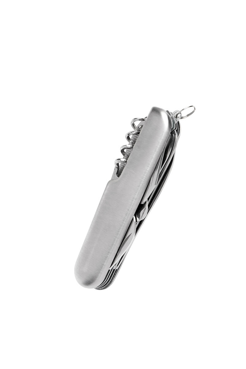 Navaja metálica con 9 funciones; compacta y resistente. Entre sus funciones incluye: Navaja, tijeras, sierra para madera, abrelatas, destornillador plano y de cruz, destapador, lima, punzón plano, sacacorchos y aro para llavero. Es una herramienta que com