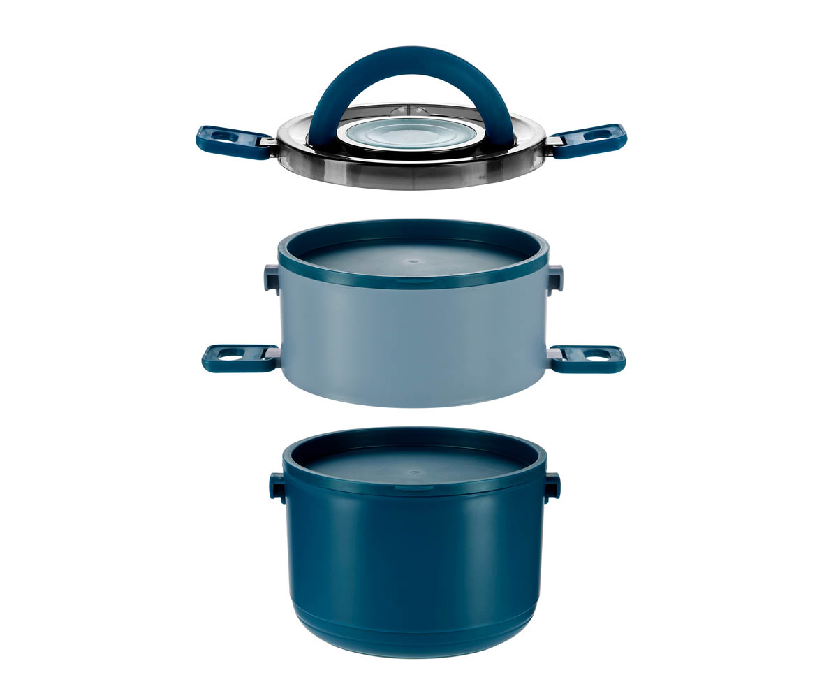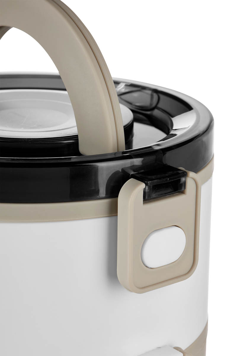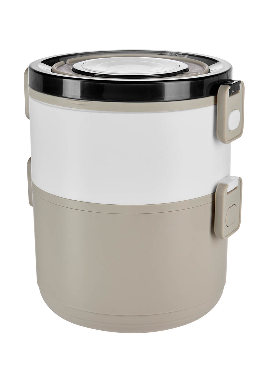 Contenedor de alimentos con dos pisos independientes que permite separar tus alimentos y no mezclar sabores. Fabricado con una pared sencilla de plástico, ideal para el uso de microondas. Tapa con válvula de seguridad y función de sellado para evitar derr