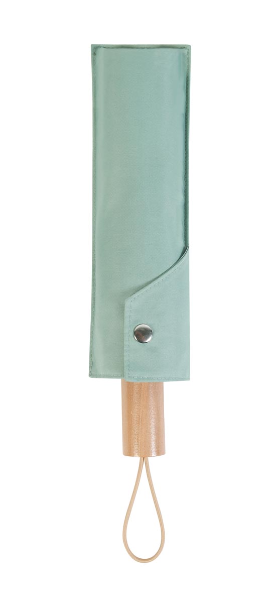 Paraguas de bolsillo de 8 paneles. Sistema de abertura manual. Mango de madera con asa elástica. Incluye funda individual con botón metálico que permite abrir para volver a guardar el paraguas fácilmente.
