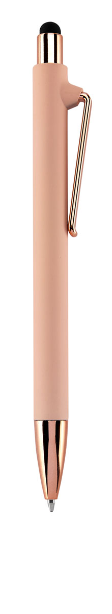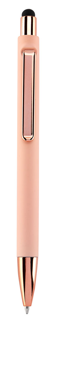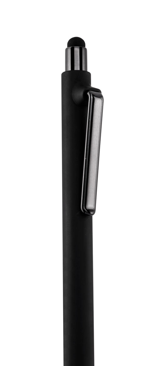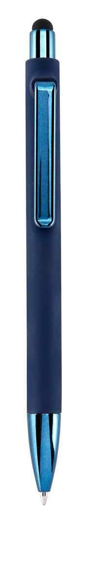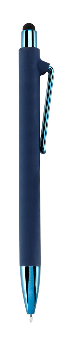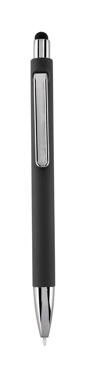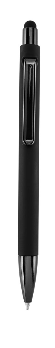 Bolígrafo con terminado tipo rubber y touch screen. Mecanismo pulsador. Botón, clip y punta en color metalizado al tono.