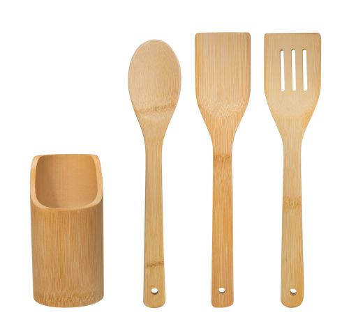 Juego de 3 utensilios de bambú para cocinar. Incluye cuchara, pala, volteador y una base cilíndrica. La madera es un producto natural el cual puede presentar variaciones en tonalidades y vetas.