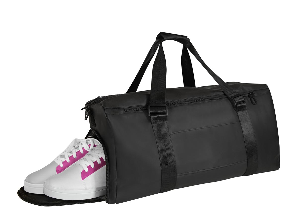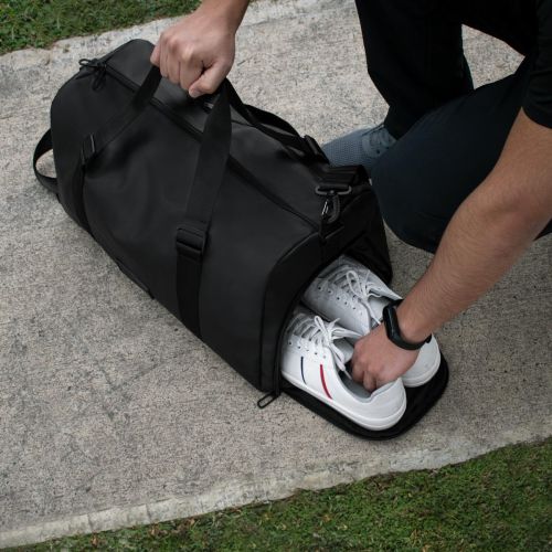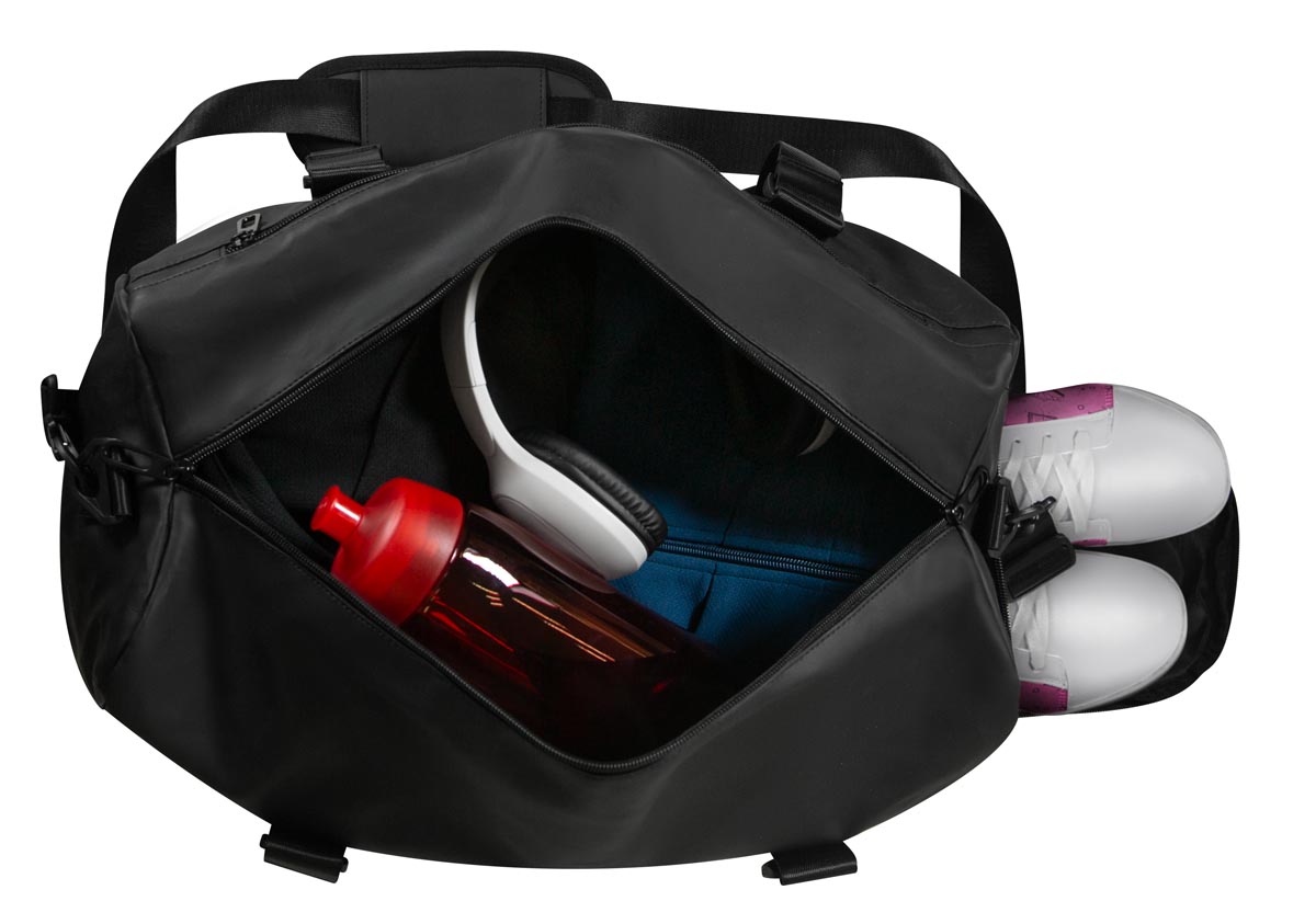 Diseño deportivo. Compartimento principal con cierre, bolsillo interno con cierre y bolsillo interno simple. Bolsillo lateral con zapatera, bolsillo trasero con forro resistente al agua. Cuanta con aditamento trasero para colocar en trolley. Asa de