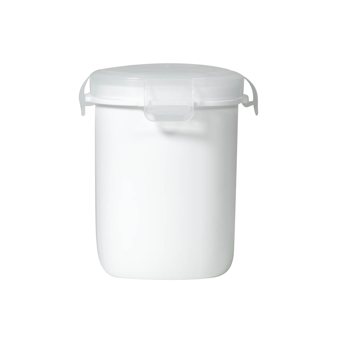Vasito contenedor de plástico con tapa con cuatro pestañas y sello hermético para evitar derrames. Compacto y versátil, es perfecto para llevar tus snacks sin preocupaciones.