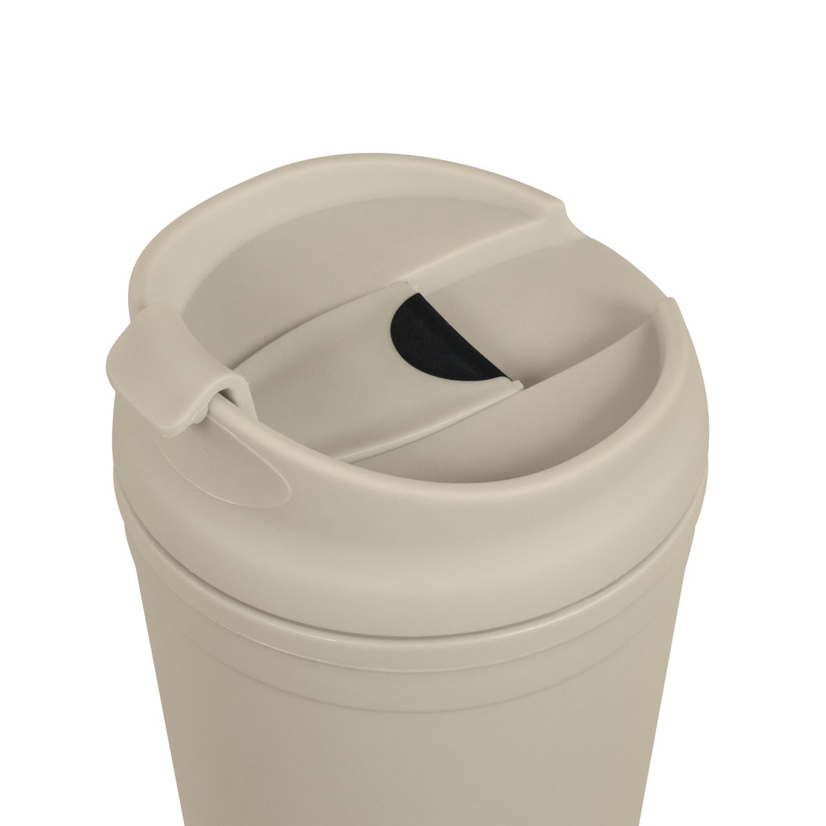Doble pared. Pared interna y externa de plástico. Tapa de plástico con sistema de rosca. Sobre tapa con sistema de push.Incluye popote. Cuerpo y tapa con terminado tipo rubber. Caja individual incluida.