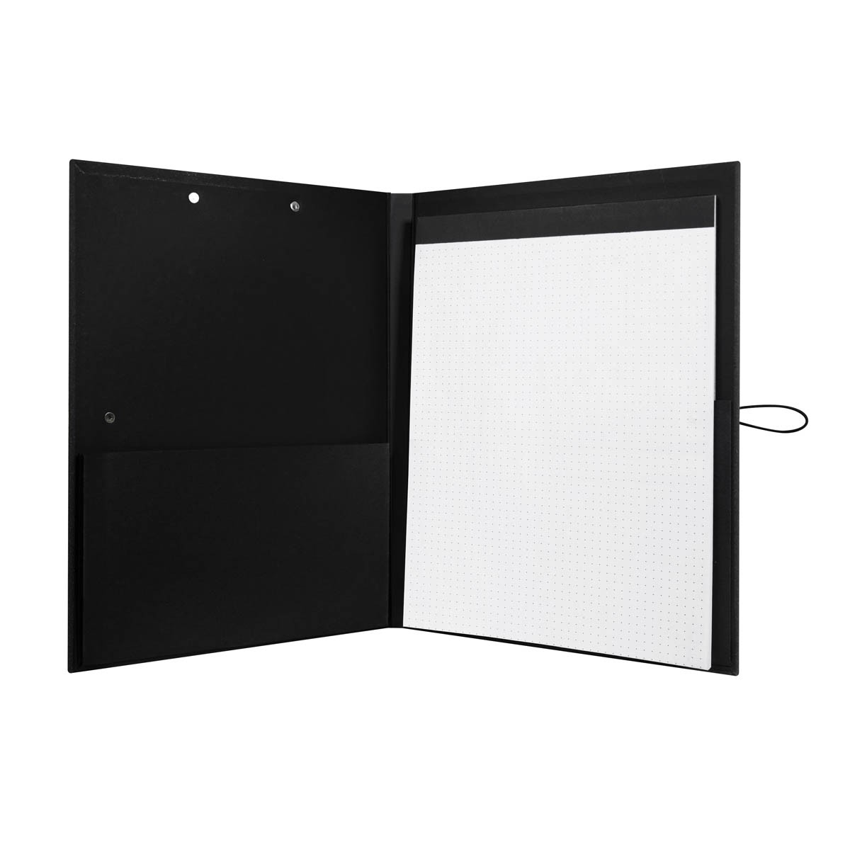 Carpeta con práctico clip metálico y soporte retráctil en la parte superior. Incluye block de 30 hojas con retícula de puntos y compartimento interno. Su elástico ayuda a mantenerla cerrada y evitar extraviar documentos. Utilizala como carpeta o como tabl