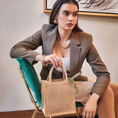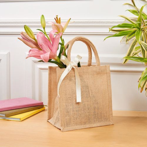 Bolsa mini con fuelle, asas redondeadas e interior plastificado. Su tamaño compacto la hace ideal para transportar objetos pequeños o utilizarla para regalos.