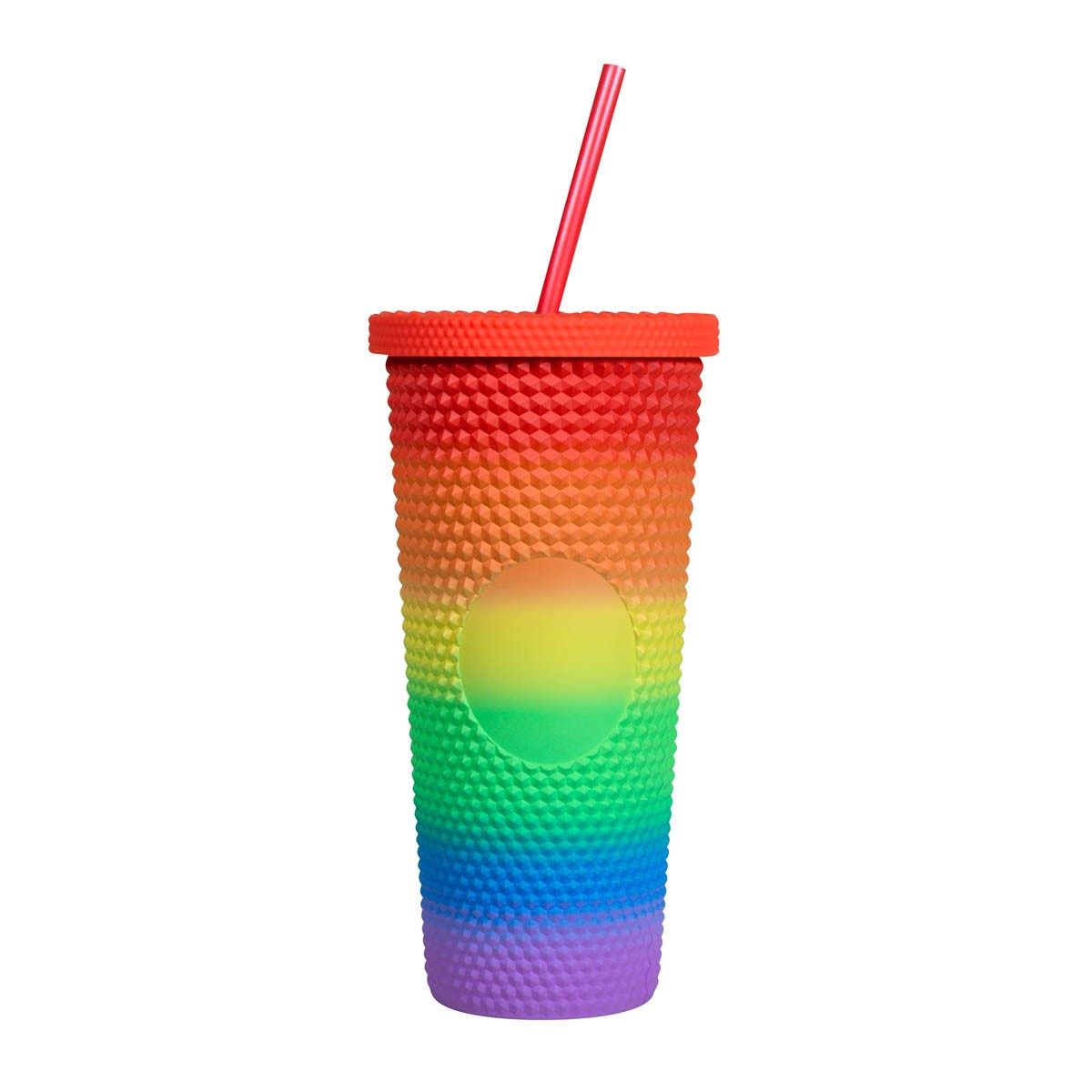 Doble pared. Pared interna y externa de plástico. Tapa de plástico con cierre de rosca. Terminado ruber y textura de picos. Incluye popote y caja individual.
