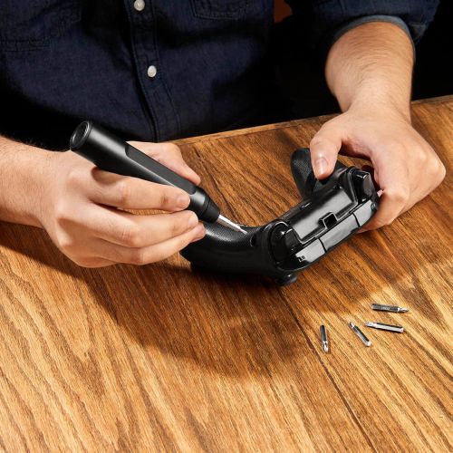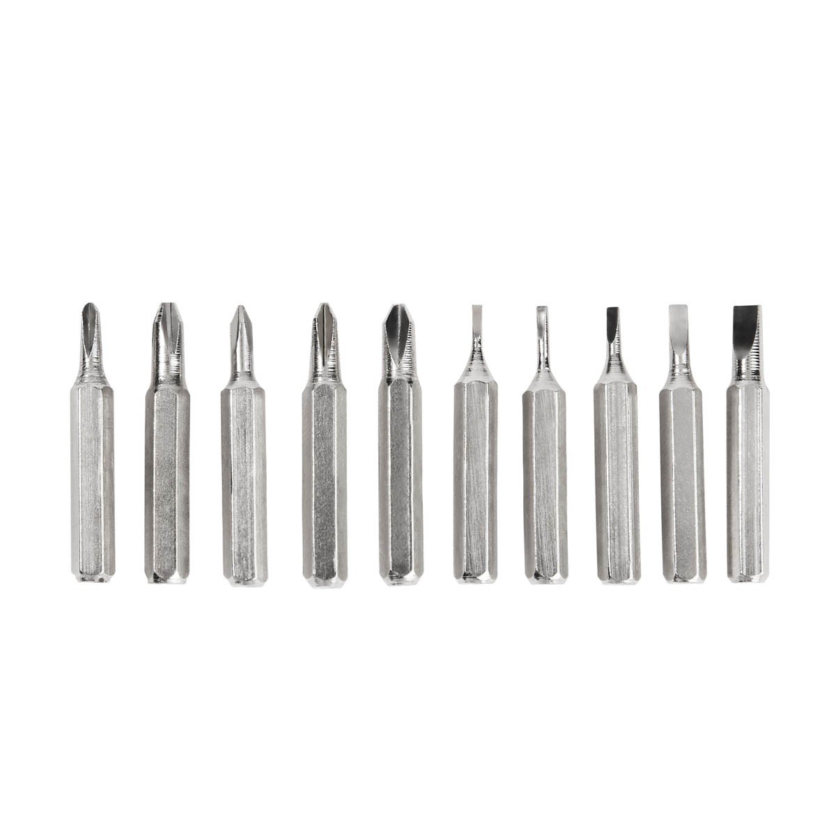 Desarmador con 10 puntas intercambiables. Incluye 5 puntas de cruz y 5 planas, organizadas en un compartimento interno que las mantiene seguras y al alcance de tu mano. Su innovador sistema push para abrir y cerrar asegura que las puntas permanezcan en su