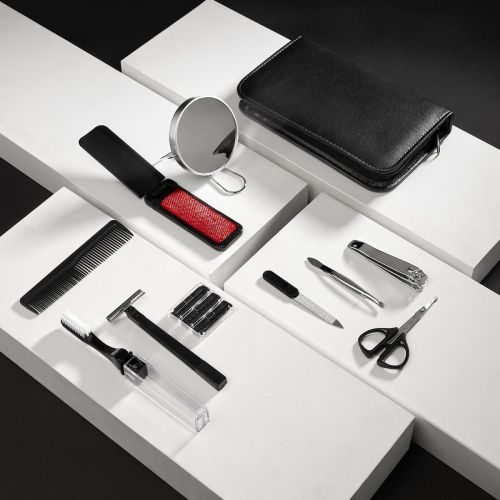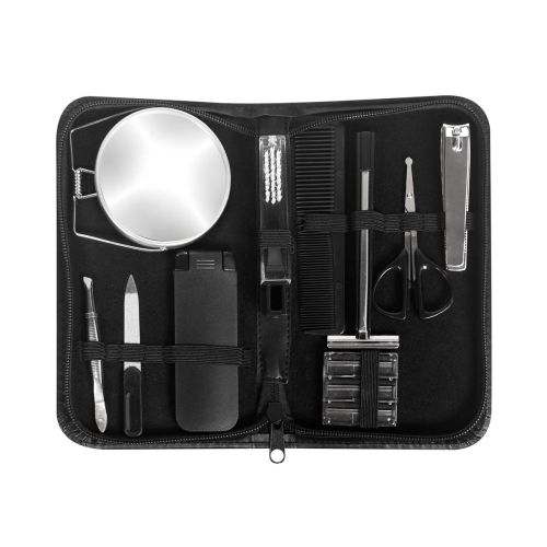 Set de cuidado personal. Ideal para tus viajes, mantente impecable en cualquier momento. Incluye los siguientes 10 accesorios: espejo, lima, cortaúñas, pinzas, tijeras, peine, cepillo dental, rastrillo con 3 navajas de repuesto y un calzador plegab