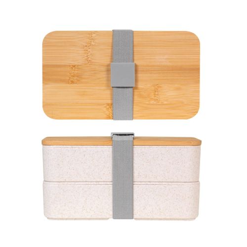 Contenedor de alimentos con doble compartimento. Capacidad total de 1 litro. Incluye tenedor, cuchillo y cuchara. Su fabricación lo hace amigable con el medio ambiente, al incorporar fibra de trigo en sus materiales. La elegante tapa de bambú asegura tus
