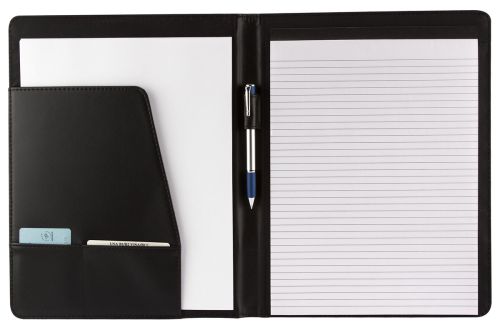 Incluye block de raya tamaño A4 con 20 hojas, compartimento para bolígrafo, documentos y tarjetas. No incluye bolígrafo.