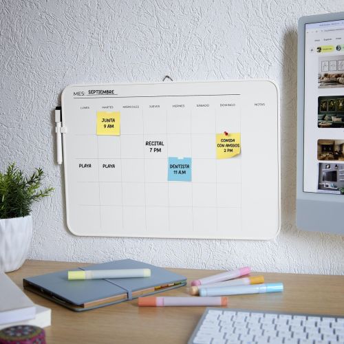 Pintarrón con planeador mensual ideal para organizar tus prioridades. Incluye marcador con borrador y gancho superior para colgarlo fácilmente en tu espacio de trabajo. Su retícula te permite personalizar mes y días, perfecto para uso diario en el hogar,