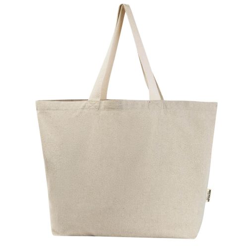 Bolsa ecológica de algodón reciclado. Con fuelle en la base y asas de algodón. Incluye un bolsillo interior con botón para mantener organizado tus artículos más pequeños. Su amplio tamaño te permite llevar todo lo necesario. Ideal para los d
