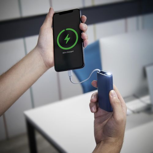 Batería auxiliar de para smartphone, capacidad 5,000 mAh. Contiene 1 puerto de entrada tipo C para carga de la batería y 1 puerto de salida USB para carga de dispositivos. Adicional 1 cable integrado tipo C. Incluye lámpara con luz LED, display indicador