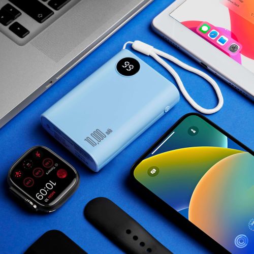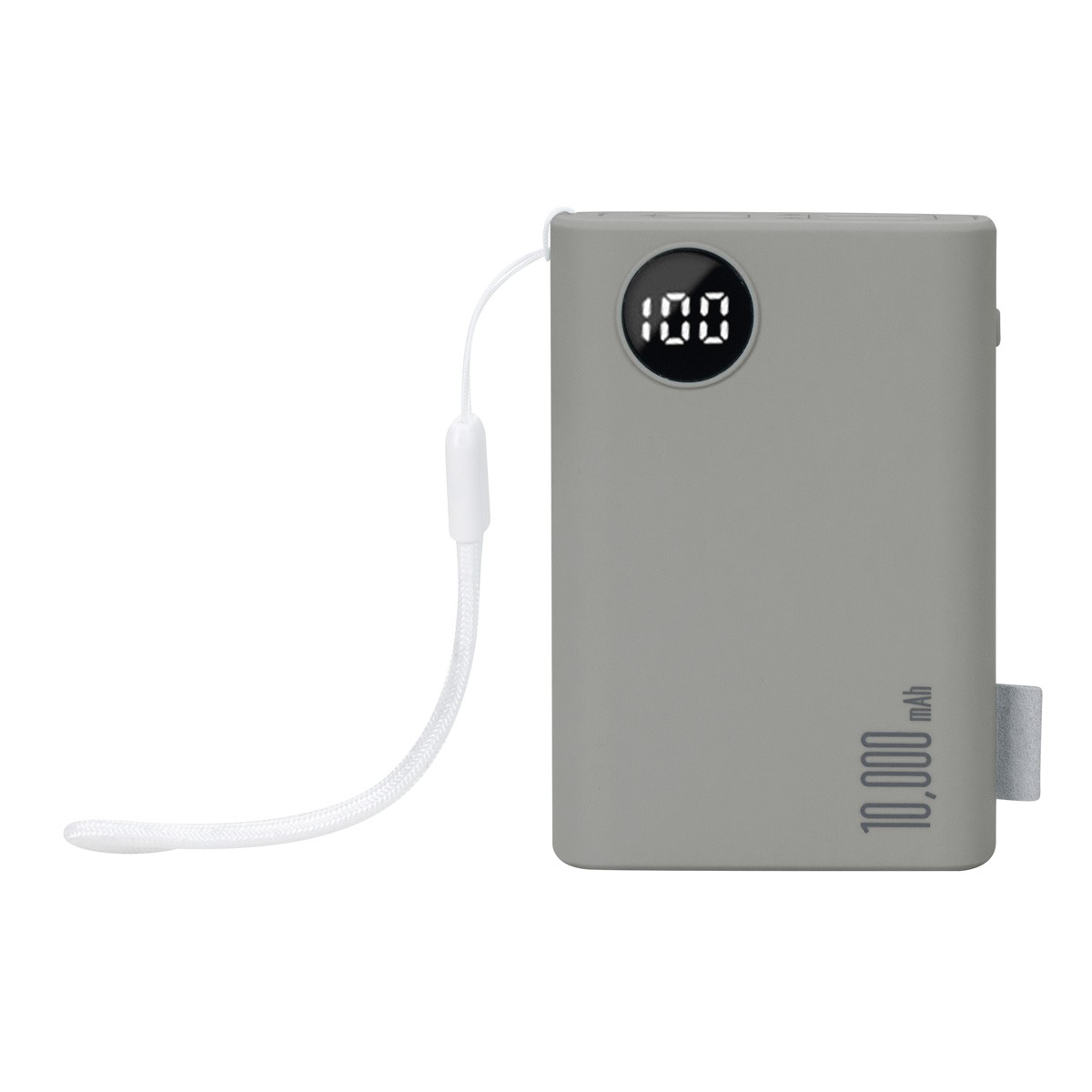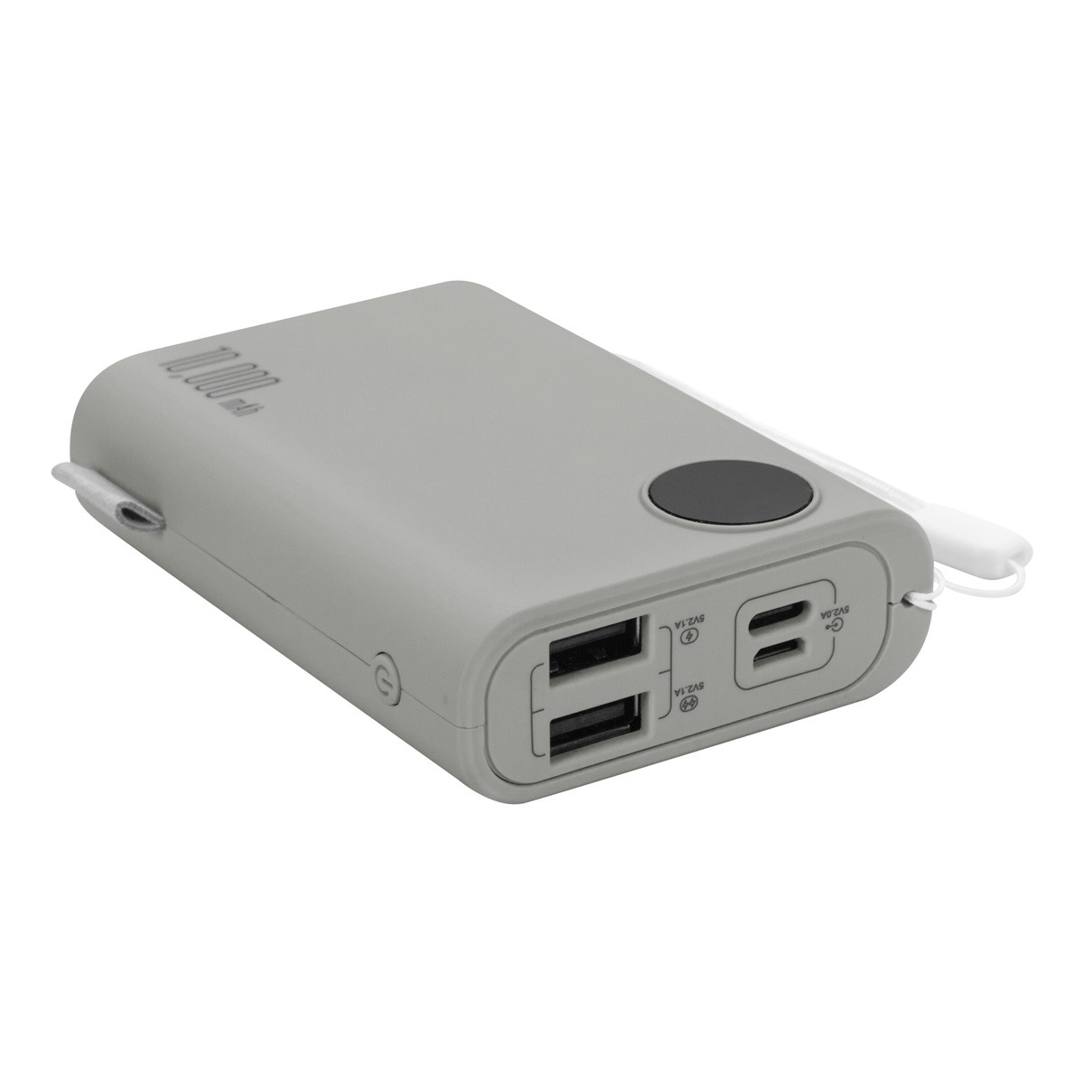 Batería auxiliar para smartphone, capacidad 10,000 mAh. Contiene 2 puertos de entrada, micro USB y tipo C para carga de la batería y 2 puertos de salida, USB y tipo C para carga de dispositivos. Incluye display indicador de carga, cable con conector tipo